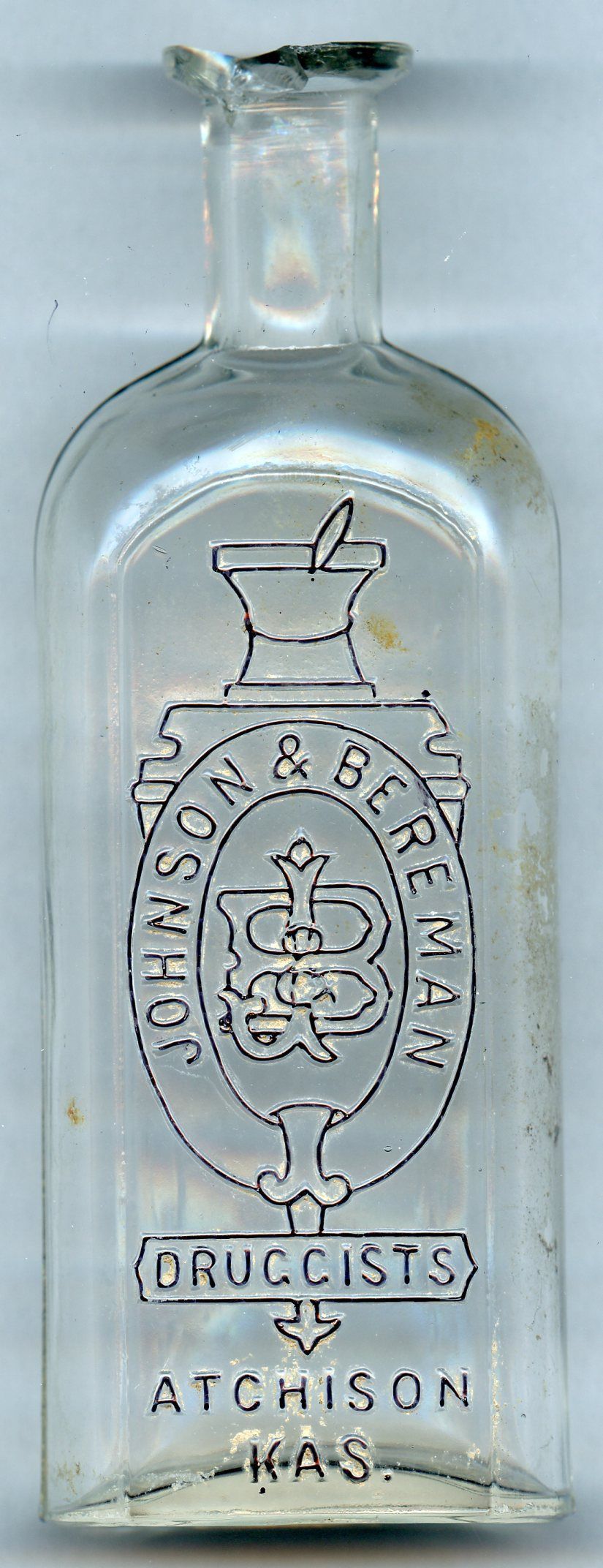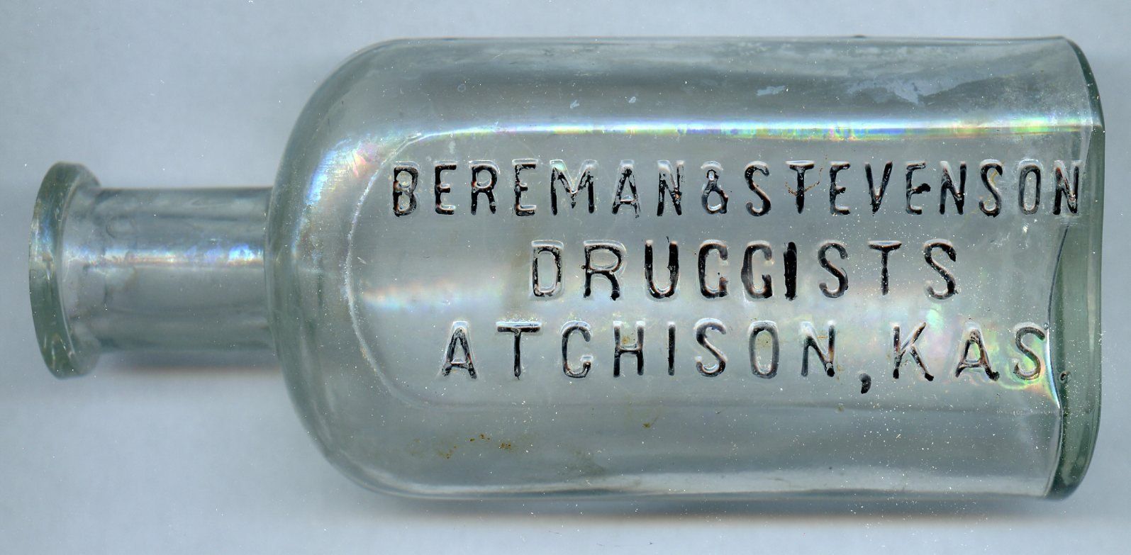 Samuel O. Bereman came from Iowa to Atchison, KS in 1873 and buys out Mr. Gunn from the Crane and Gunn Drug Store, creating the Crane and Bereman. Then Sam buys out Crane in 1875 and it's simply Bereman's. 1878 sees William Johnson buying in and it is the Johnson & Bereman. In 1881, Johnson is out, and Stevenson is in, but only lasts until 1882, when it is back to just Bereman's. Dr. Williams is in and out in 1886, and Griffin makes the scene in 1887, which again, only lasts a year. In 1888, it is Bereman & Ritner, which runs until 1904, when Ritner buys out Bereman. and old Sam disappears.