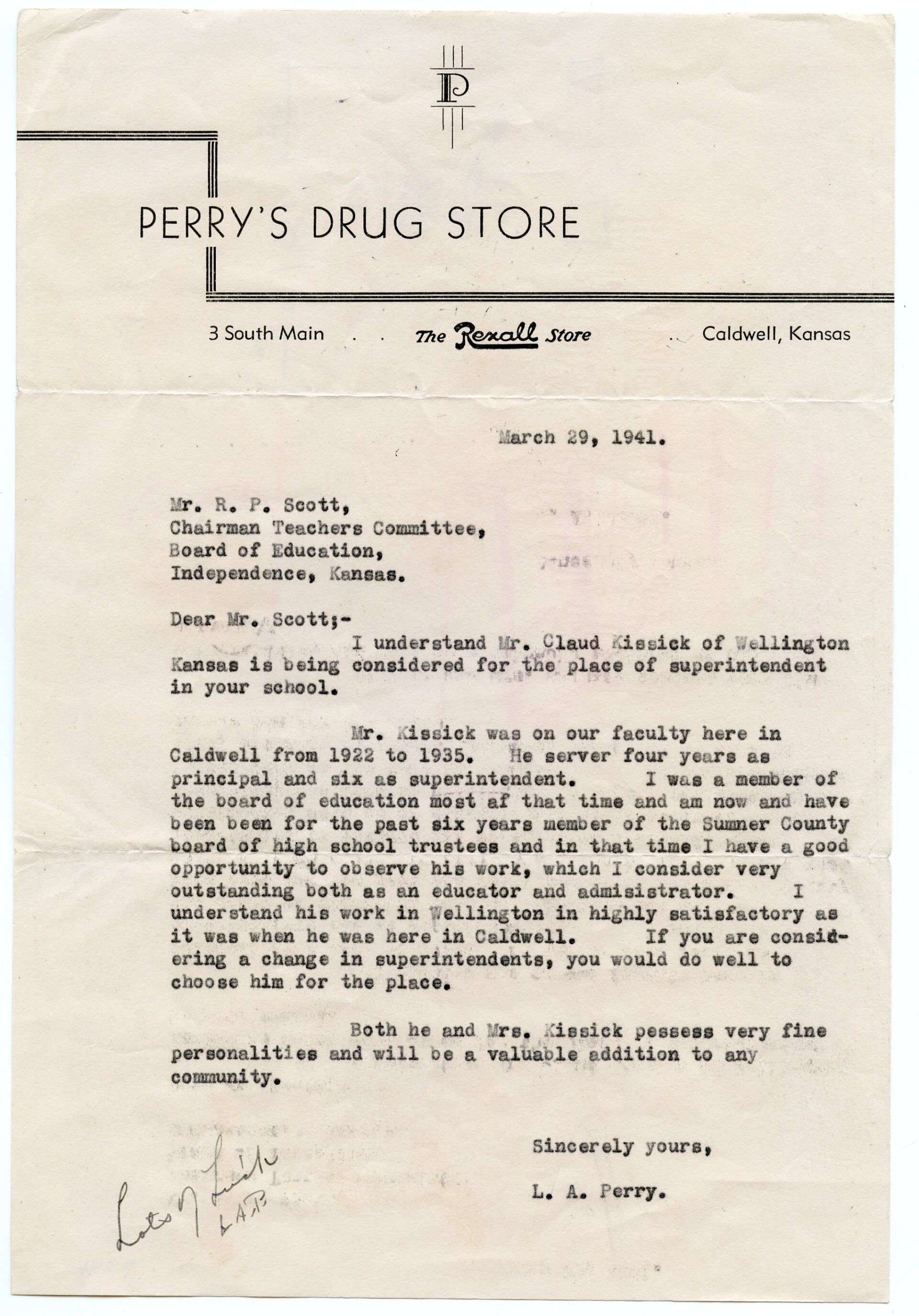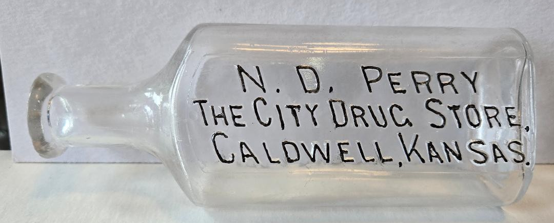 In 1903, the father and son team of N.D. & L.A. Perry came from Wichita to Caldwell, KS, and bought the C.S. Lynch & Co. Drug Store. Originally operated under the name of N.D. Perry's City Drug Store, in 1913, son L.A. bought his father out and changes the name to the L.A. Perry Rexall Store. This continues at least until 1923, when I loose track of him.