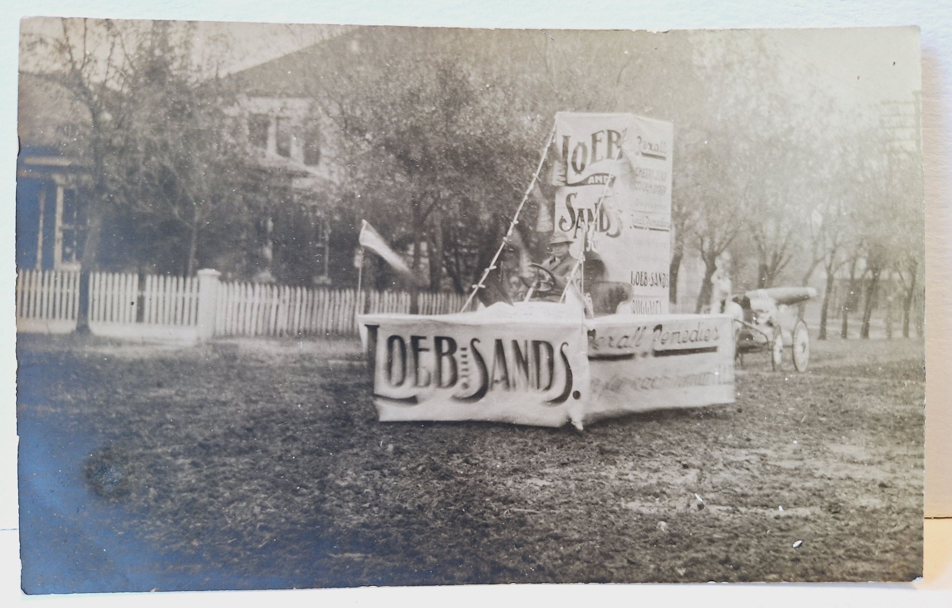 Lewis Loeb left Kansas City in 1899 to take a job in Junction City, KS, at the Holzschuher Drug Store. A year later, he was ready to have his own store, so with Gordon Hollis, they bought the B. H. Ward Drug Store and changed the name to Loeb & Hollis. In 1901, he was accosted by two masked men while walking in the park. He knocked one of them to the ground and escaped the second. Having established his reputation as a man of action, in 1905, he was on the street as the town's fire wagon came racing towards him. He quickly realized that the driver was not holding the reins, and was heading for a crash. Loeb ran along side of the wagon and was able to grab the bit of one of the horses, and dragged his feet until they came to a stop. About the same time, he bought out his partner Hollis and changed the name to the Loeb Drug Store. Two years later, he takes on a different partner, Earl Sands, and it becomes the Loeb & Sands. The next year, 1908, they enter a float in the Corn Carnival Parade, as seen in the picture post card above. That is Loeb driving his Buick Roadster, which has been decked out with a wooden framework holding all the signs and pennants. Behind him is the smaller entry of a towed 6 foot cigar from the C. O. Williams' Cigar Store. Loeb loses his partner again in 1909, and ran the store by himself (back to the Loeb Drug Store) until he sells out to J. E. Brasfield in 1912, and leaves town. I'm sure Junction City was a little quieter for many without him.