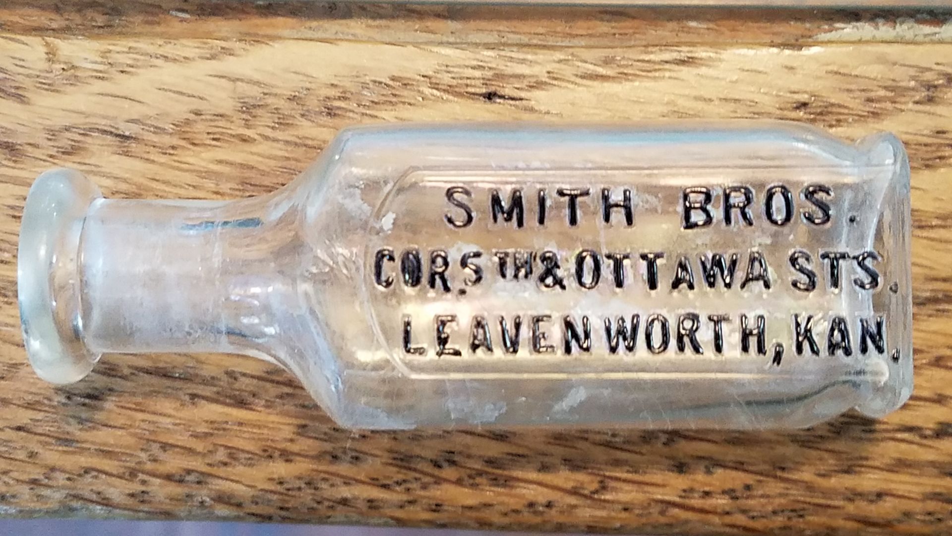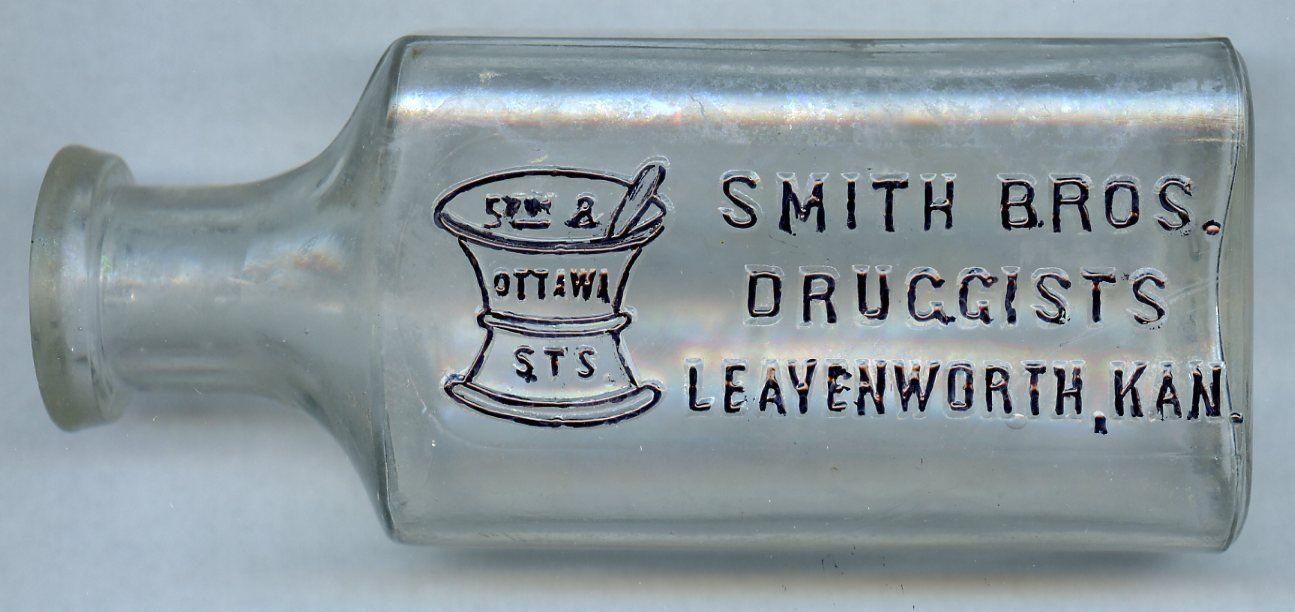 10179 Smith Bros., Druggists; 1891-1904; Clear glass, back and bottom embossed, for cork stopper, corner seams to neck, Knickerbocker style; 1.7" x 1.1" x 4.1"; Courtesy Crispin's Drug Store Museum, Lincoln, KS