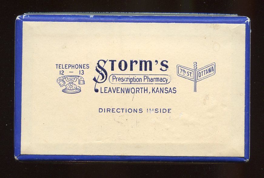 10189 Storm's Prescription Pharmacy; Cardboard shoulder box with hinged lid, "Telephones 12 - 13", "7th St. & Ottawa"; 2.6" x 1.6" x 0.6"; Courtesy Crispin's Drug Store Museum, Lincoln, KS