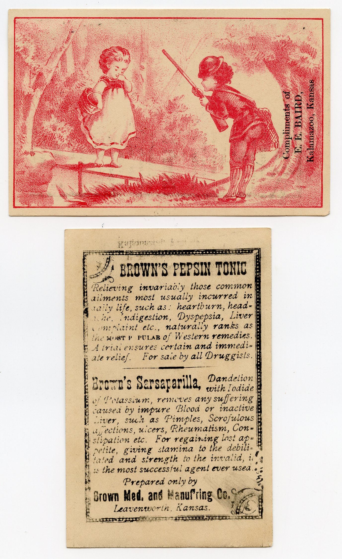 10538 Brown Medicine & Manufacturing Co.; 1876-1894; Light card stock, ads for Brown's Pepsin Tonic & Brown's Sarsaparilla; stamped: E. E. Baird, Kalamazoo, KS; 2.7" x 4.3": Courtesy Crispin's Drug Store Museum, Lincoln, KS