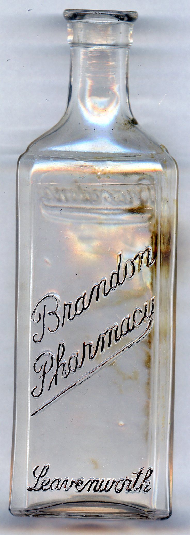 10583 Brandon Pharmacy; Clear glass; front shoulder, back & back bottom edge embossed; for cork stopper; 2.2" x 1.3" x 6.5"; Courtesy Crispin's Drug Store Museum, Lincoln, KS