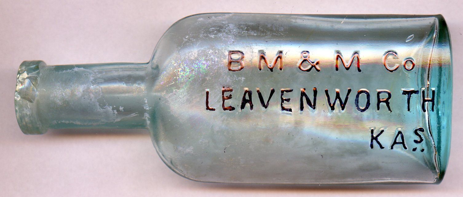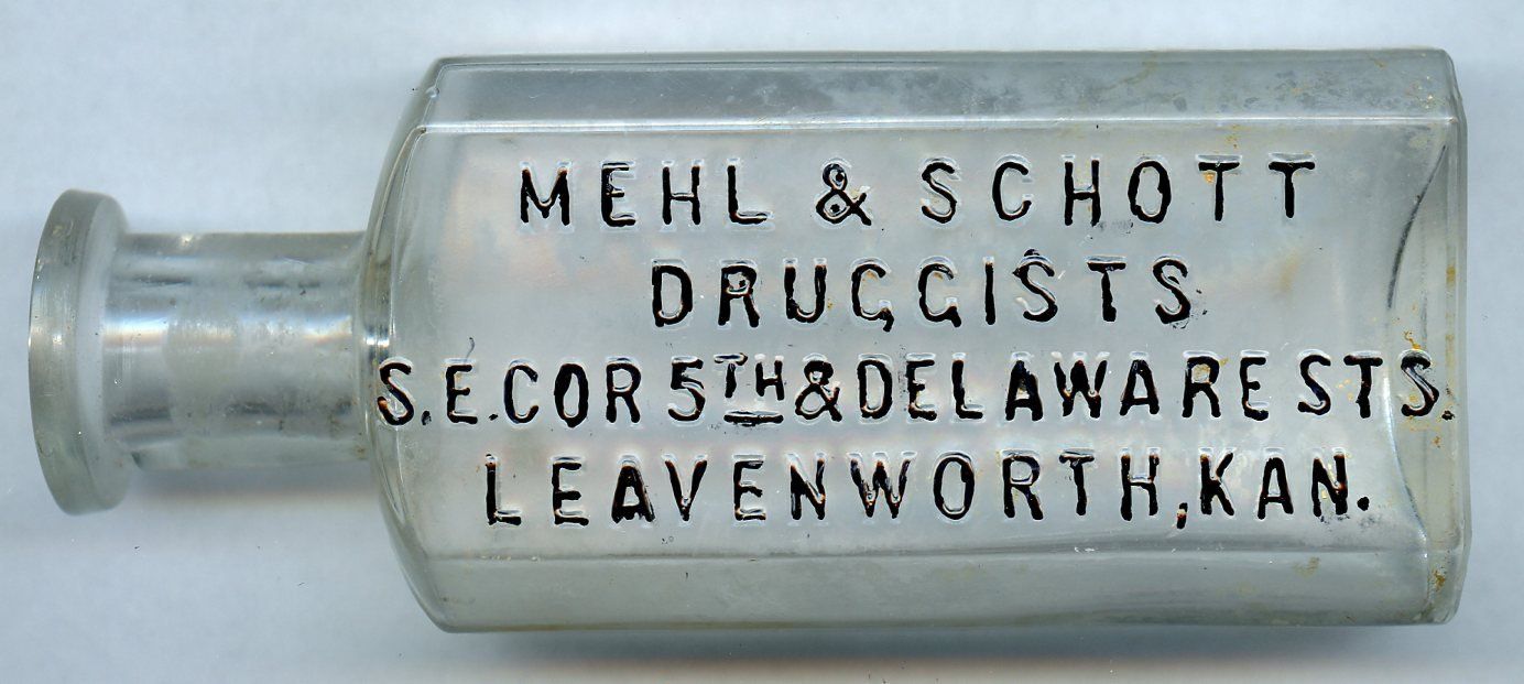 11147 Mehl & Schott, Druggists; 1888-1913; Clear glass; Blake style; embossed back; for cork stopper; 1.7" x 1" x 4.3"; Courtesy Crispin's Drug Store Museum, Lincoln, KS