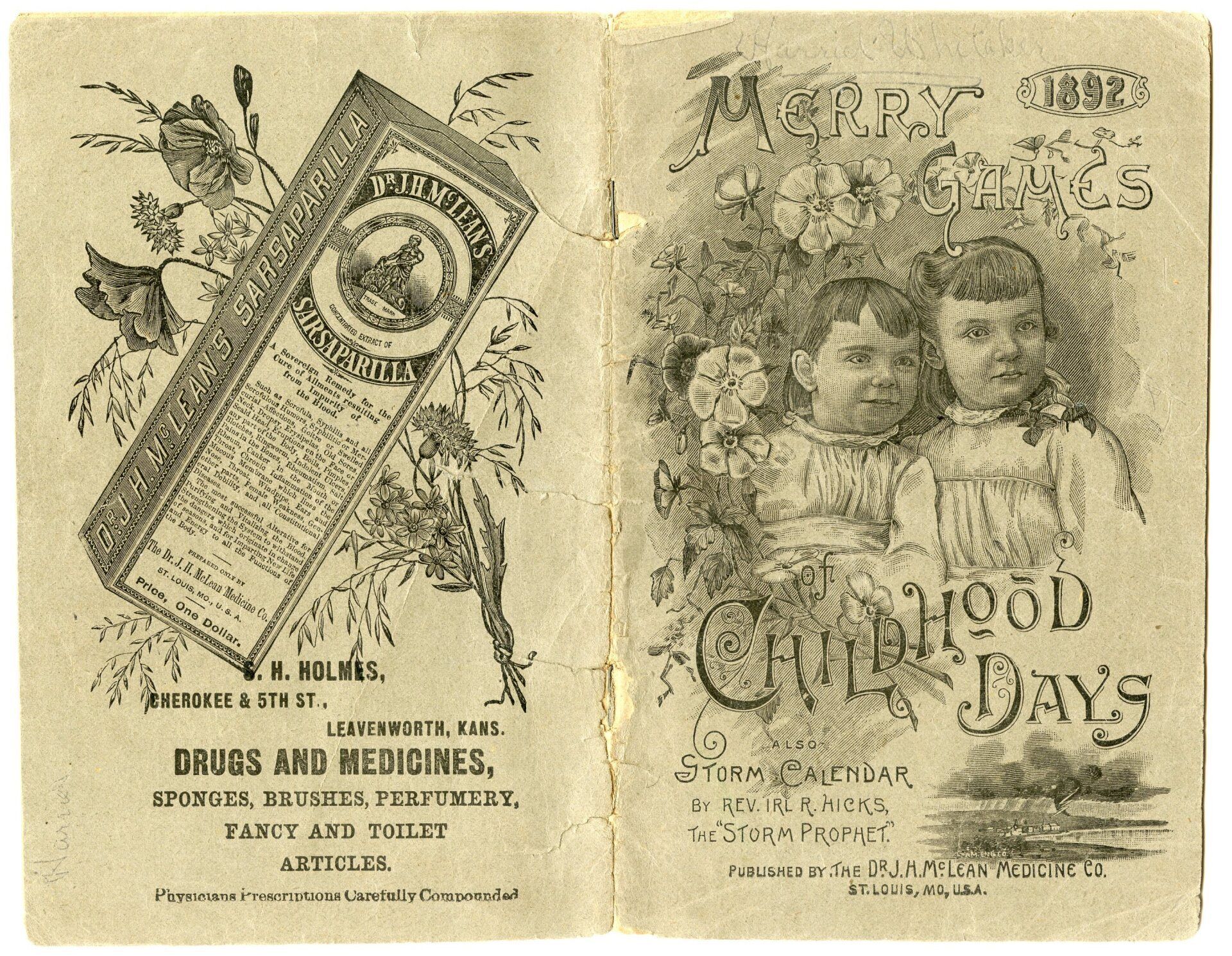 10683 Holmes, S. H.; 1875-1892; "Merry Games of Childhood Days" 1892; paper booklet; 32 pgs.; ads for Dr. J. H. McLean Medicine Co. products; 4.6" x 7.1"; Courtesy Crispin's Drug Store Museum, Lincoln, KS