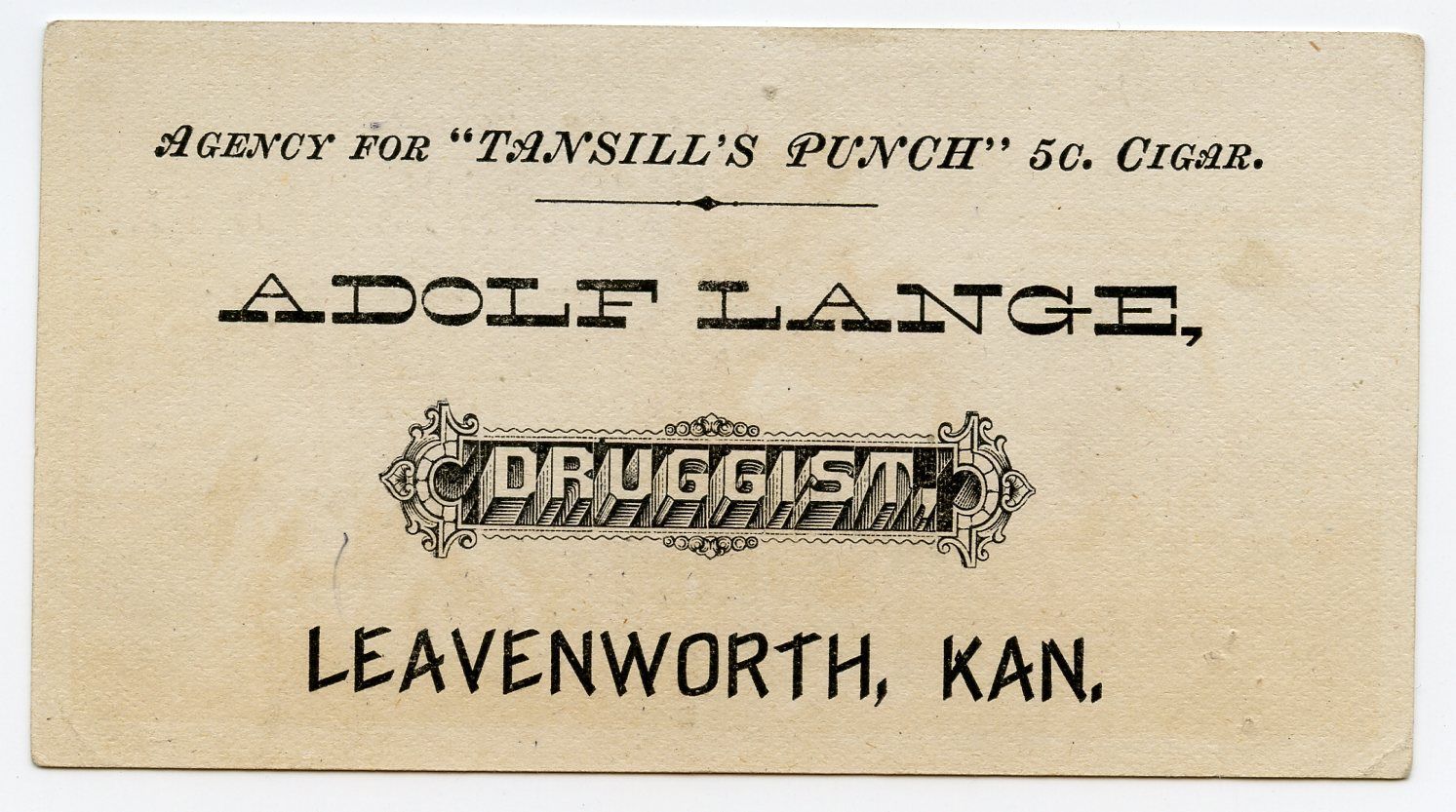 11245 Lange, Adolf, Druggist; 1880-1913; Tansill's Punch Cigar; light card stock; 4.78" x 2.5"; Courtesy Crispin's Drug Store Museum, Lincoln, KS