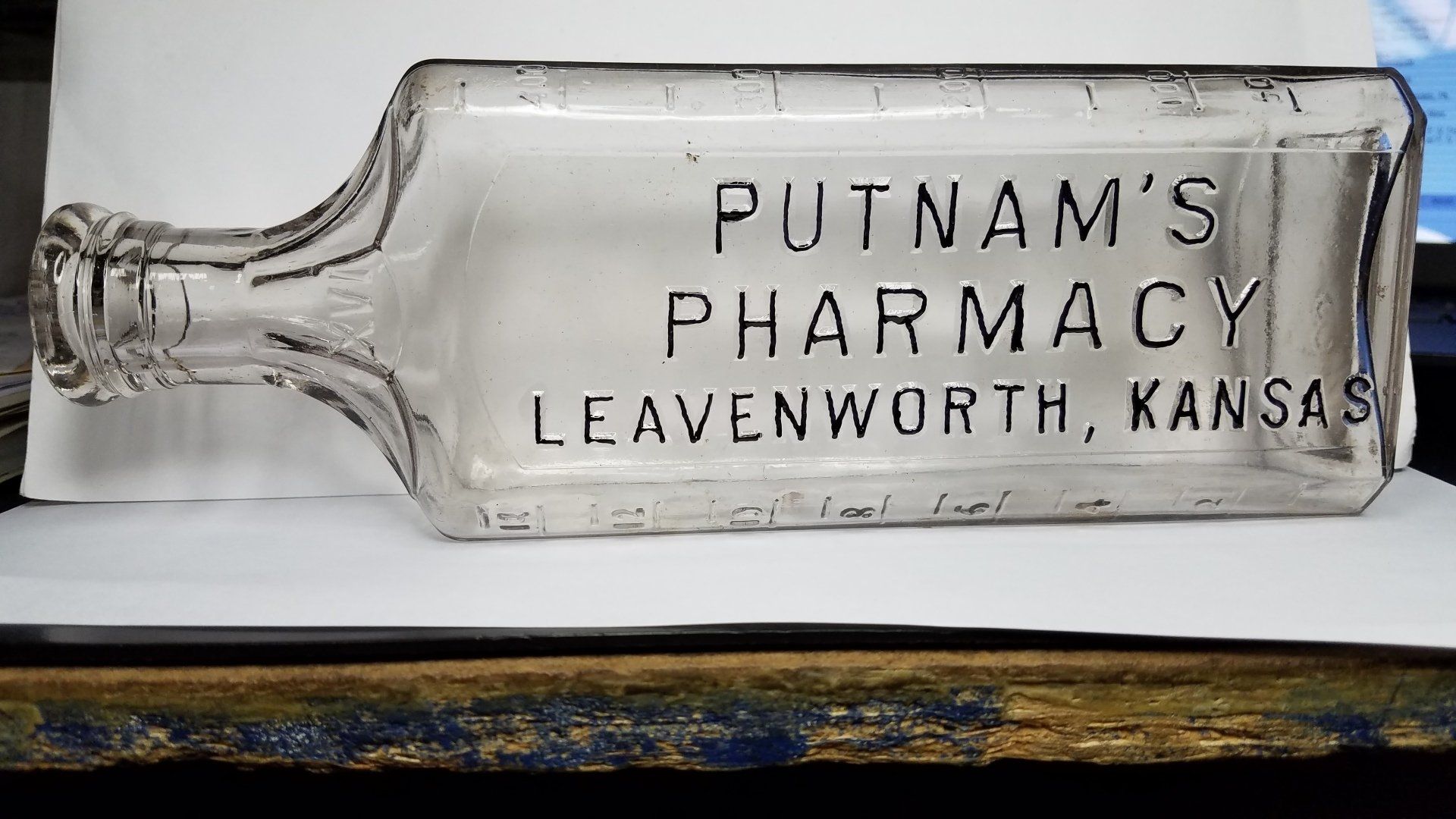12466 Putnam's Pharmacy; 1900-1913; clear glass; back embossed (high-lighthed); 16 oz. size; 3" x 1.8" x 8.8"; Courtesy Crispin's Drug Store Museum, Lincoln, KS