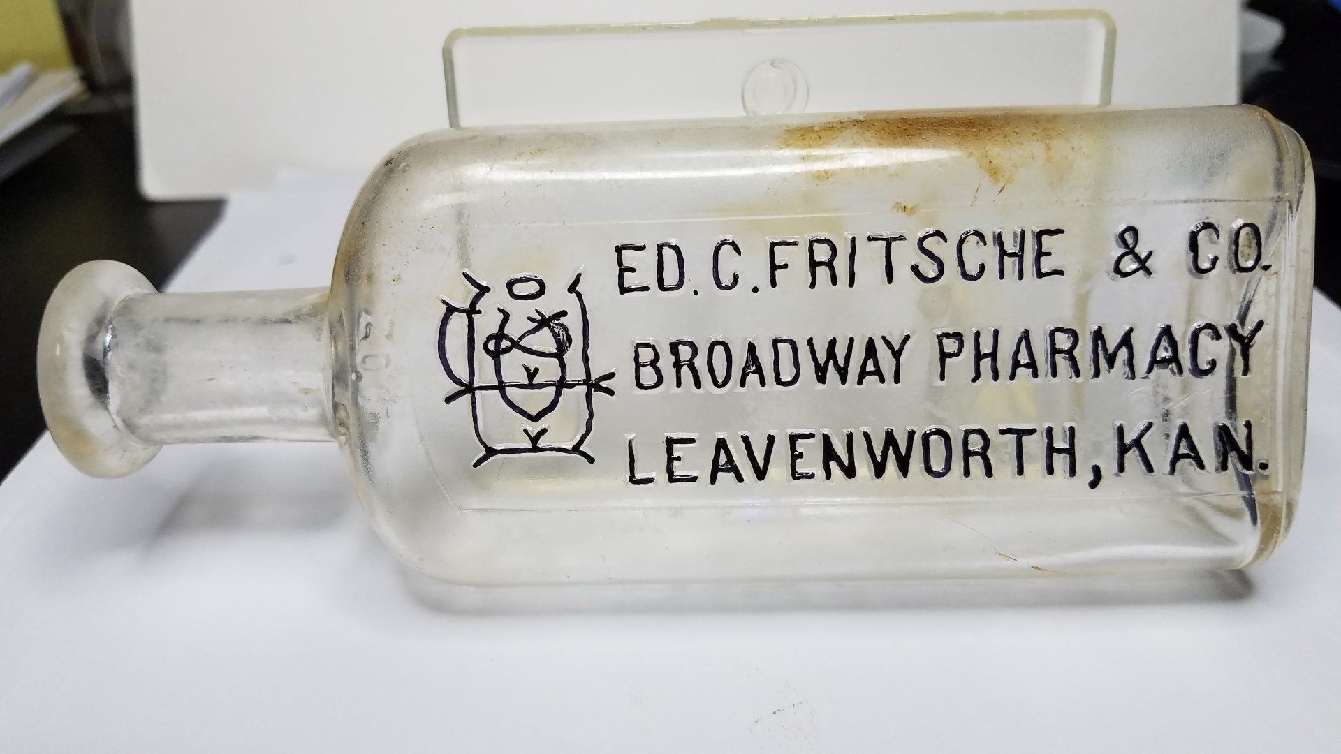 12468 Ed. C. Fritsche & Co., Broadway Pharmacy; 1913; clear glass; Double Philadelphia Oval style; 4 oz. size; 2.1" x 1" x 5.5"; Courtesy Crispin's Drug Store Museum, Lincoln, KS