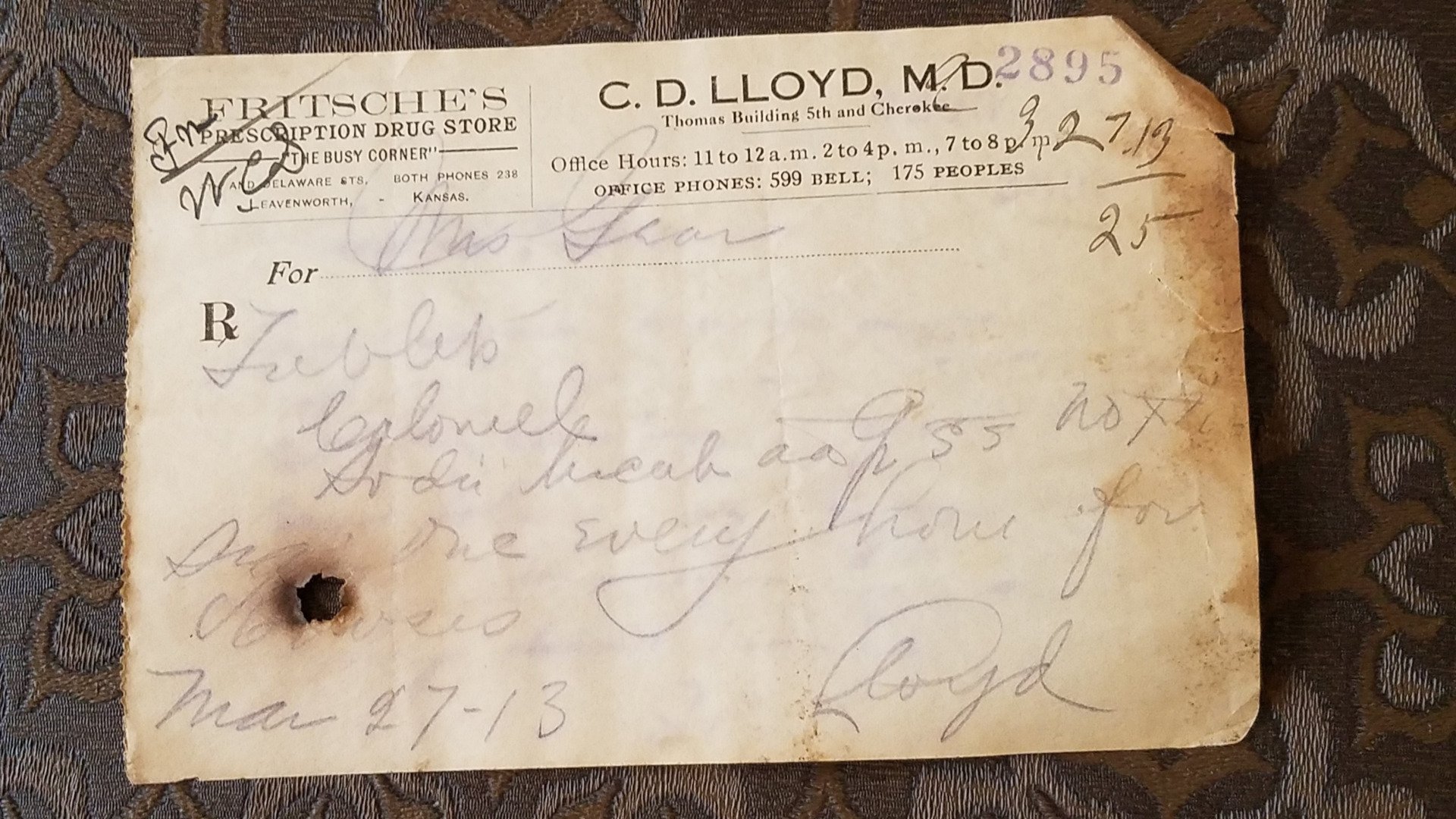 12557 Fritsche's Prescription Drug Store: 1888-1913; used prescription blank printed for C. D. Lloyd, MD; 5.36" x 3.7"; Courtesy Crispin's Drug Store Museum, Lincoln, KS