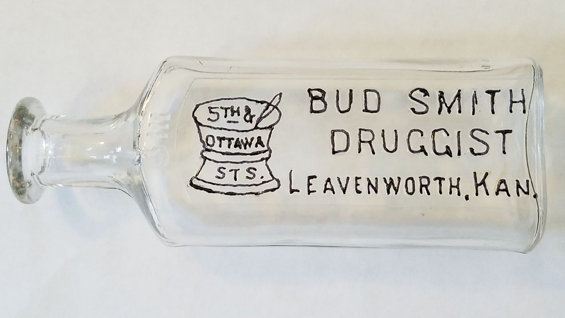 12763 Smith, Bud, Druggist: 1908-1913; clear glass Philadelphia Oval style; embossed back; 3 oz. size; 1.8" x 1.1" x 5"; Courtesy Crispin's Drug Store Museum, Lincoln, KS