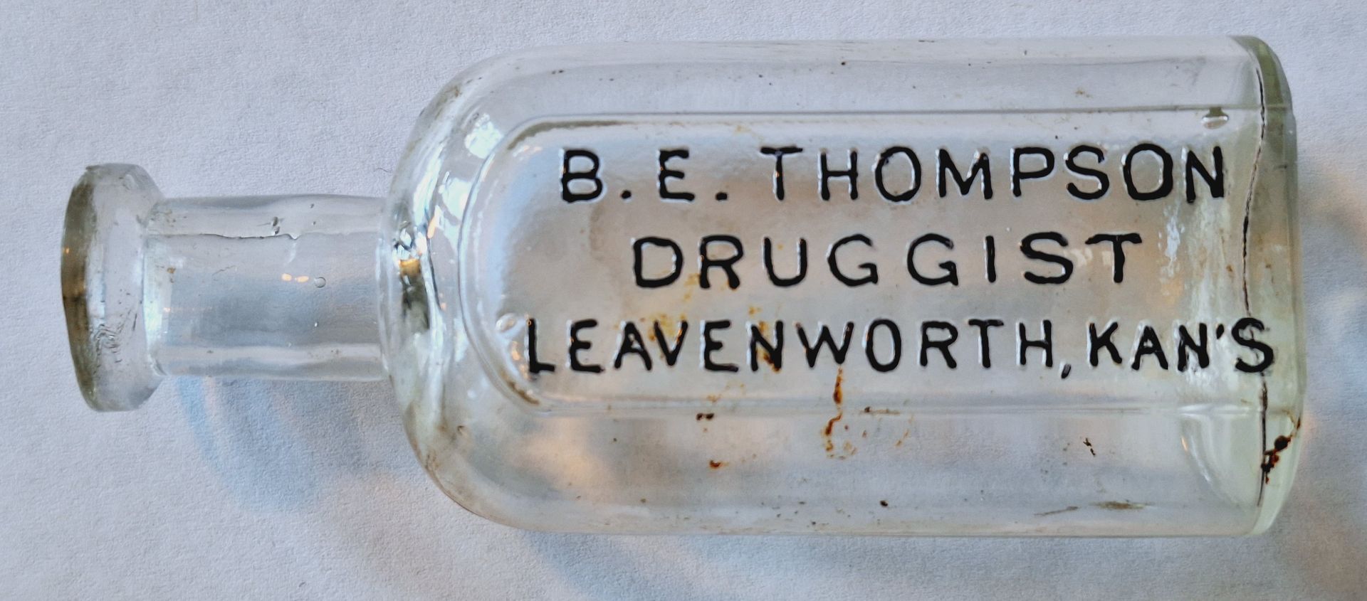 12863 Thompson, B. E., Druggist: 1877-1889; Knickerbocker Oval style; clear glass; embossed back; 1.7" x 1.1" x 4.1"; Courtesy Crispin's Drug Store Museum, Lincoln, KS