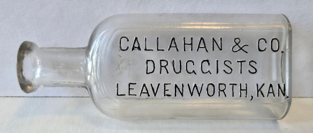 12980 Callahan & Co., Druggists: 1888-1891; clear glass Philadelphia Oval style bottle with embossed back; 3 oz. size; 2" x 1.1" x 4.7"; Courtesy Crispin's Drug Store Museum, Lincoln, KS