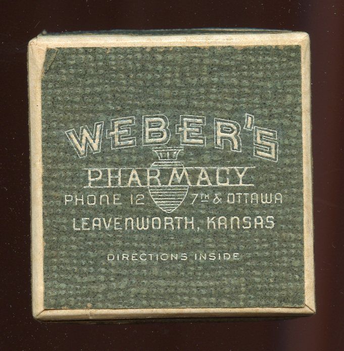 9184 Weber's Pharmacy; 1942; Carboard hinged shoulder box, paper prescription label; 7th & Ottawa; Phone 12; 1.8" x 1.8" x 0.8"; Courtesy Crispin's Drug Store Museum, Lincoln, KS