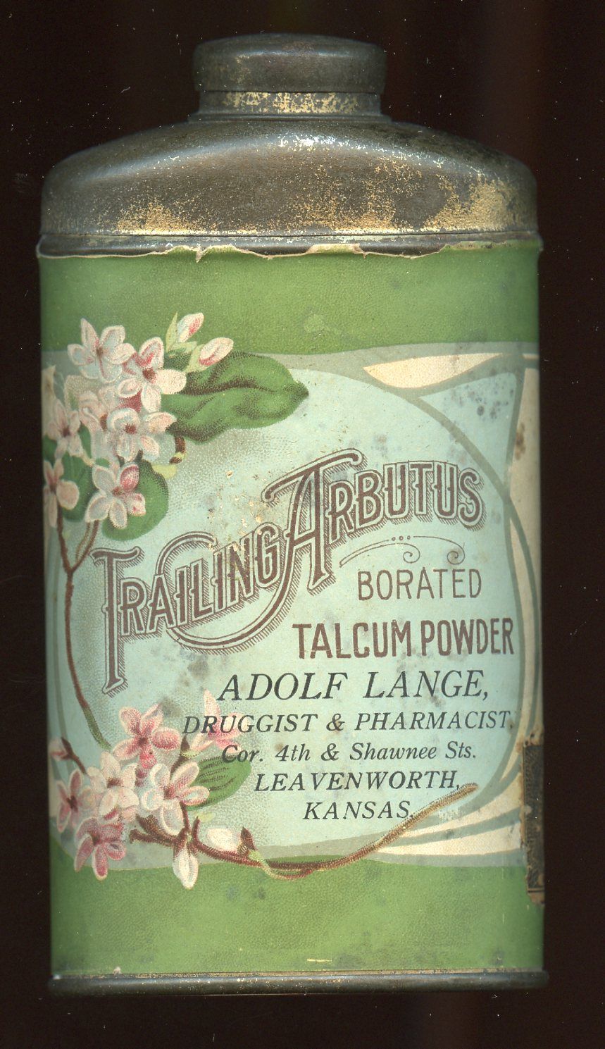 9220 Lange, Adolph, Druggist & Pharmacist; 1880-1913; Trailing Arbutus Talcum Powder, oval shaker tin with paper label; "Cor. 4th & Shawnee Sts."; 3/8 cent IRS tax stamp; 2.5" x 1.3" x 4.5"; Courtesy Crispin's Drug Store Museum, Lincoln, KS