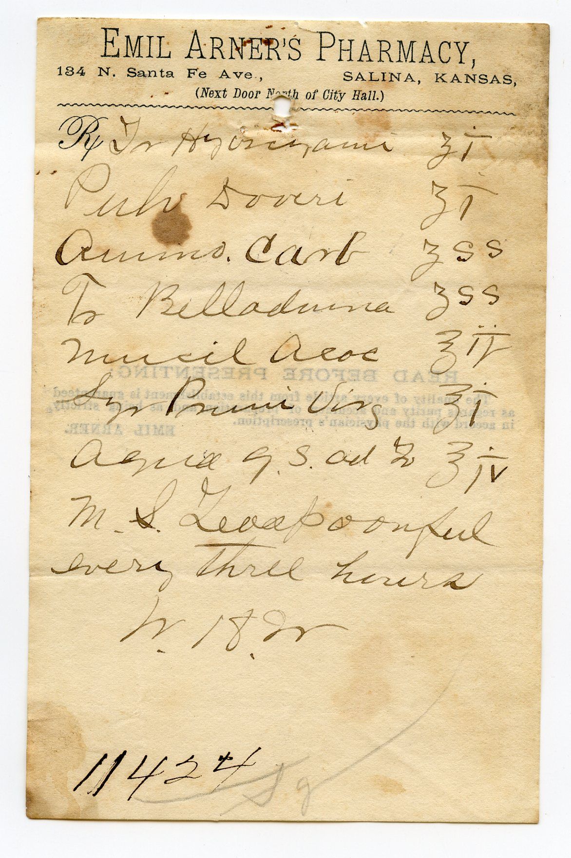 10494 Arner, Emil's Pharmacy; 1891-1894; Paper, hand writtren, undated, "134 N. Santa Fe, Next Door North of City Hall"; 3.5" x 5.5"; Courtesy Crispin's Drug Store Museum, Lincoln, KS