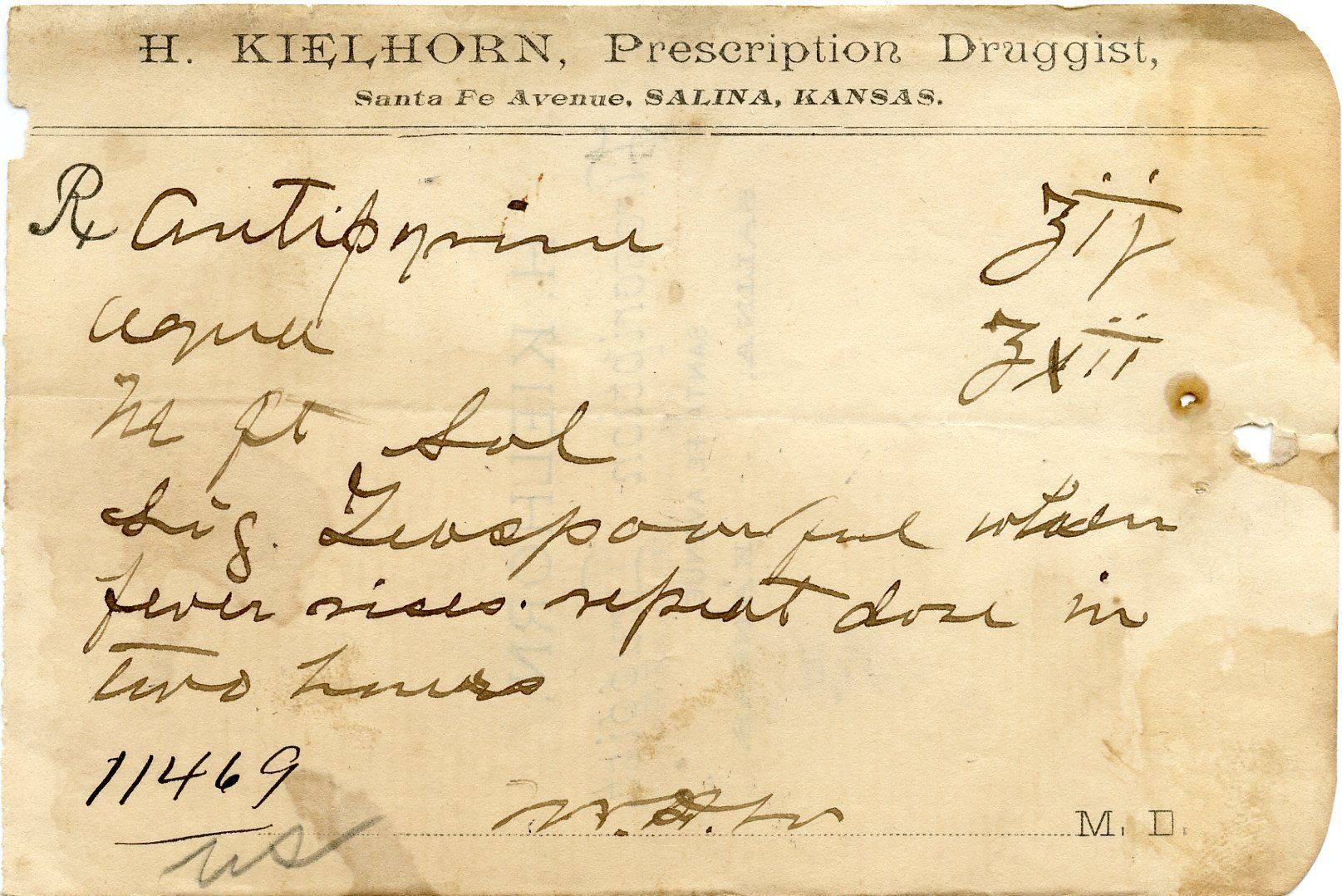 10500 Kielhorn, H. Prescription Druggist, 1886-1894; Paper, hand written, c. 1889; 5.3" x 3.5"; Courtesy Crispin's Drug Store Museum, Lincoln, KS