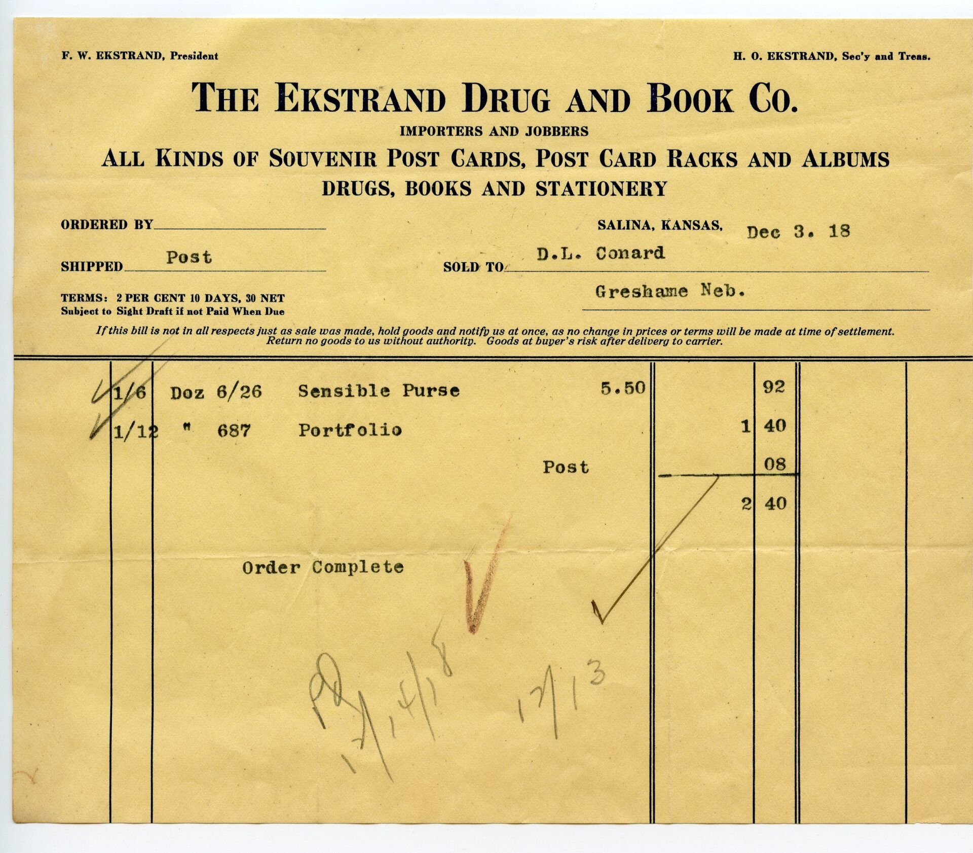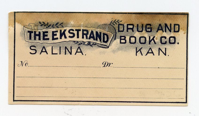 10537 Ekstrand Drug and Book Store, F. W. Ekstrand, President & H. O. Ekstrand Sec'y and Treas.; 1918; Invoice billhead; 8.2" x 6.8"; Courtesy Crispin's Drug Store Museum, Lincoln, KS