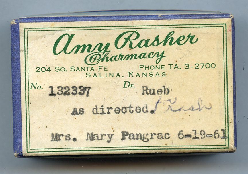 10879 Rasher, Amy, Pharmacy; 1961; Cardboard shoulder box, paper prescription label typewritten, hinged lid; 2.6" x 1.6" x 1.1"; Courtesy Crispin's Drug Store Museum, Lincoln, KS