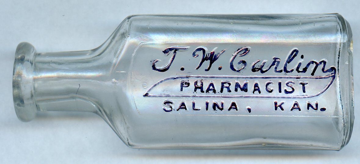 11398 Carlin, T. W., Pharmacist; 1898-1915; Clear glass, Philadelphia Oval style, 1 oz. size, for cork stopper, embossed back; 1.5" x 0.8" x 3.7"; Courtesy Crispin's Drug Store Museum, Lincoln, KS
