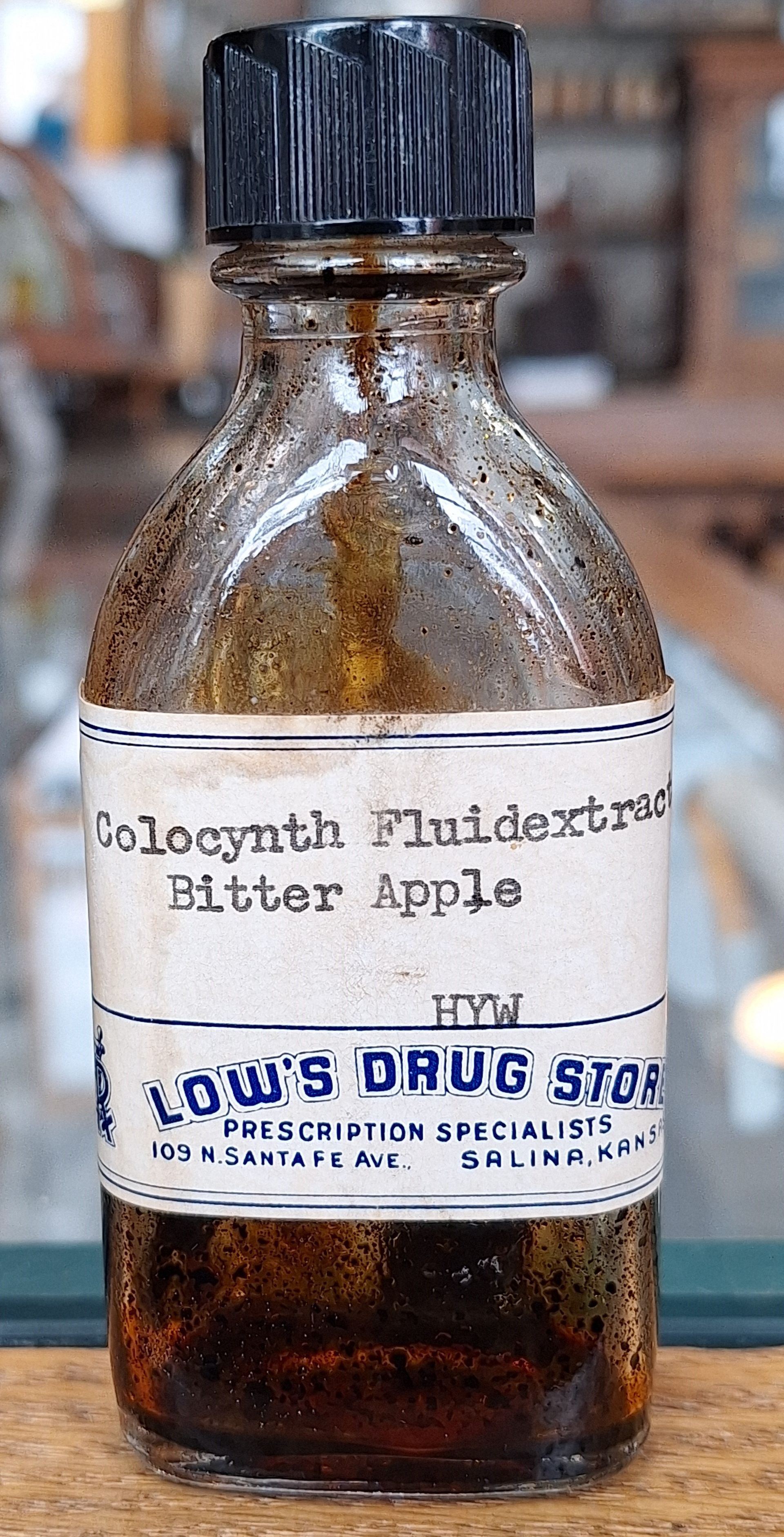 12853 Low's Drug Store: Colocynth (Bitter Apple) Fluid Extract; 2 oz. size; clear glass Rx Oval; 1.6" x 1" x 4.2"; Courtesy Crispin's Drug Store Museum, Lincoln, KS