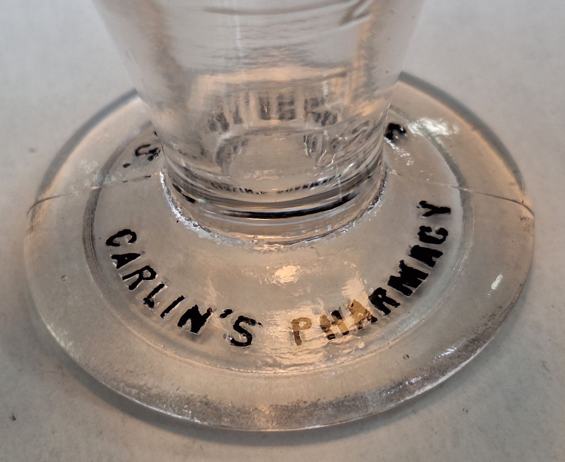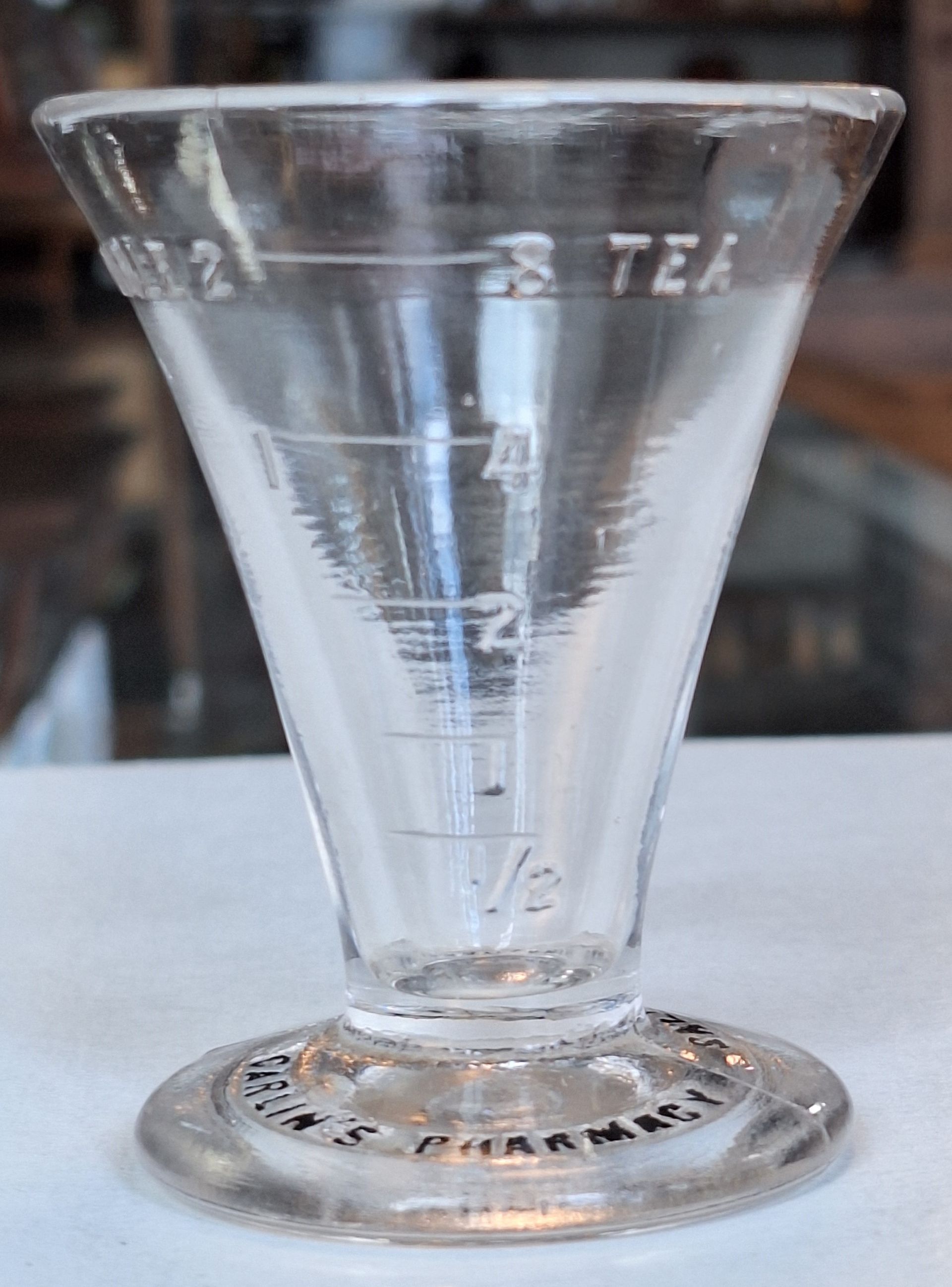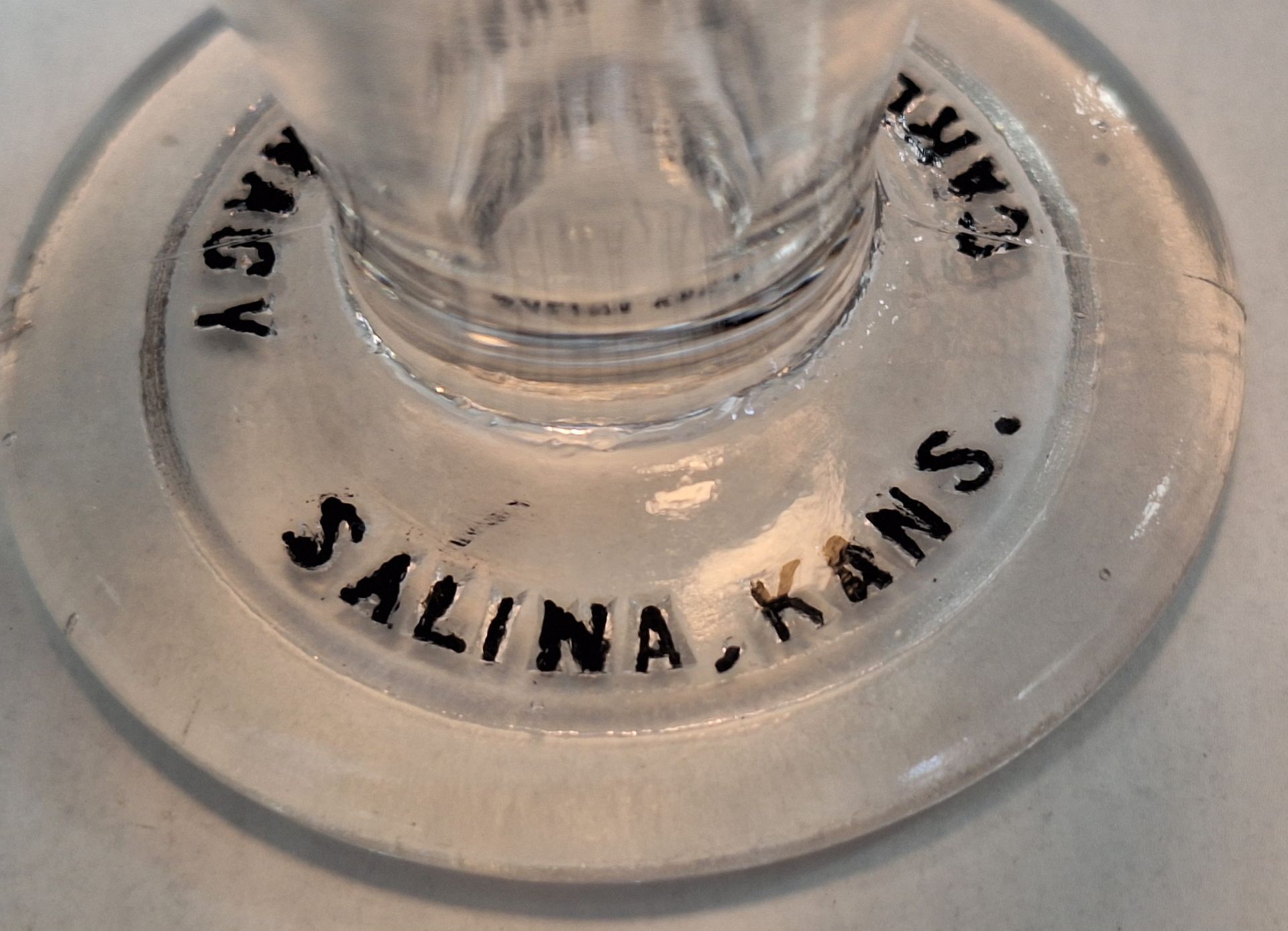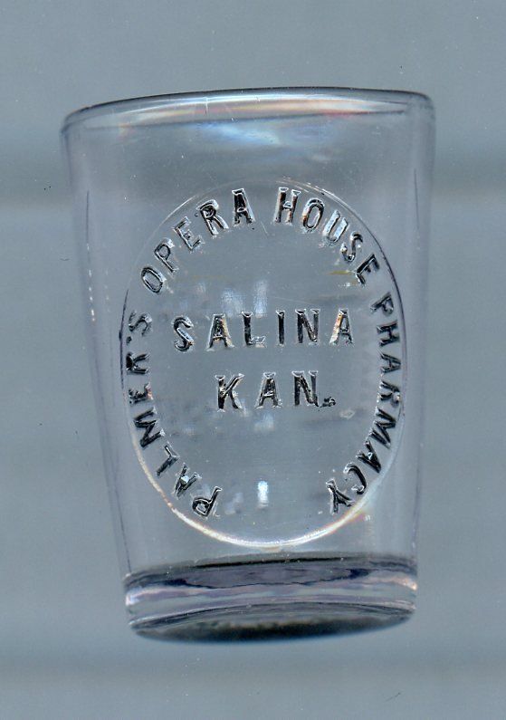 5564 National Drug Store, Frank L. Low, Proprietor; 1915; Clear glass w/ gilt rim, 4 tablespoon size, ' "NOW" THE MOST UP TO DATE DRUG STORE IN SALINA, KANSAS.'; 1.8" x 1.8" x 2.7"; Courtesy Crispin's Drug Store Museum, Lincoln, KS
