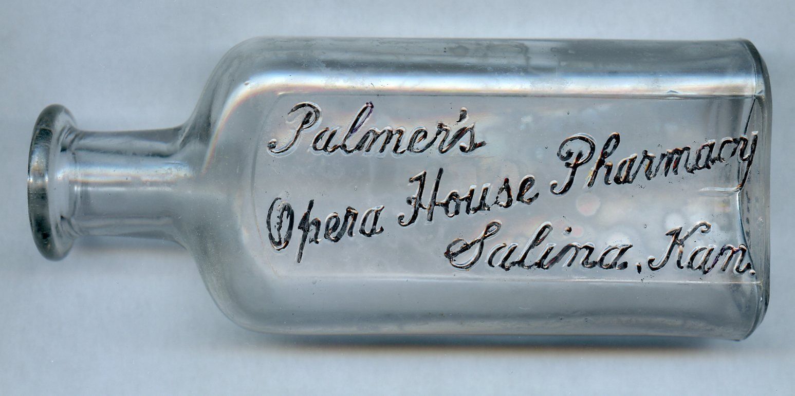 1836 Palmer's Opera House Pharmacy, 1898, Clear glass, Double Philadelphia Oval style, embossed back, side seams to neck, for cork stopper, 2" x 1.1" x 4.8"; Courtesy Crispin's Drug Store Museum, Lincoln, KS