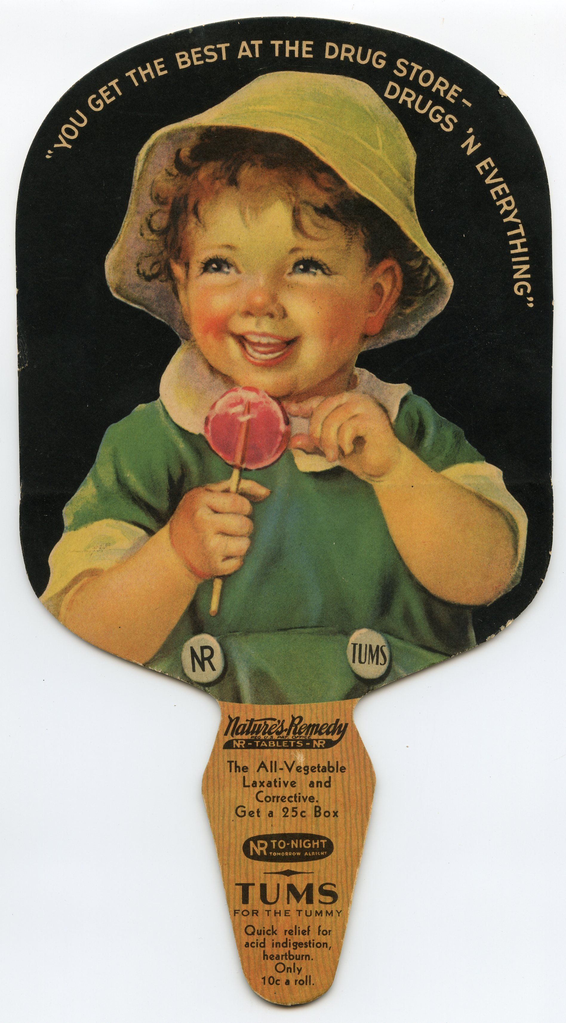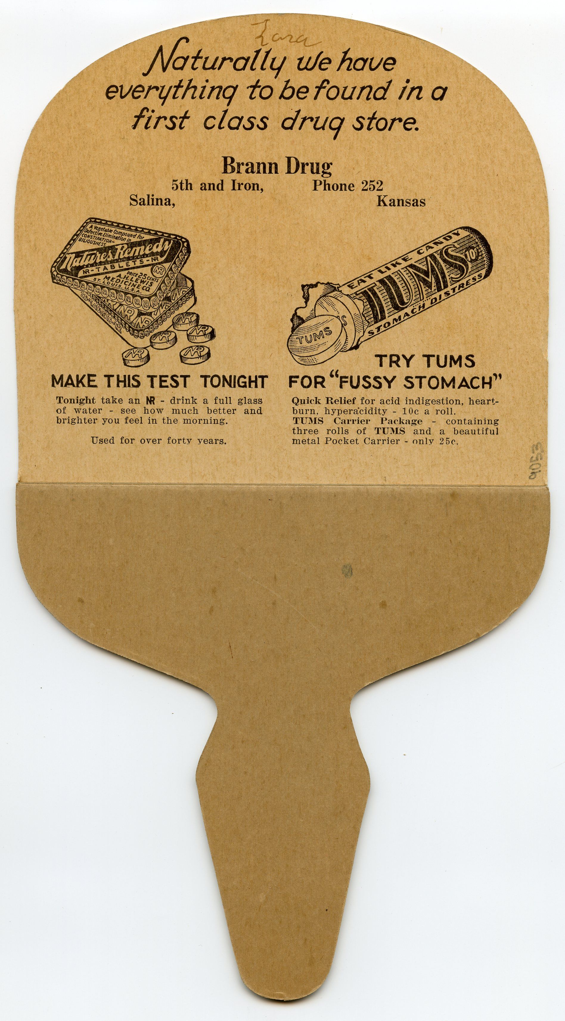 9053 Brann Drug; Fan, hand, advertising Tums & Nature's Remedy, carboard with reinforced handle; "5th and Iron" "Phone 252"; 6" x 11"; Courtesy Crispin's Drug Store Museum, Lincoln, KS