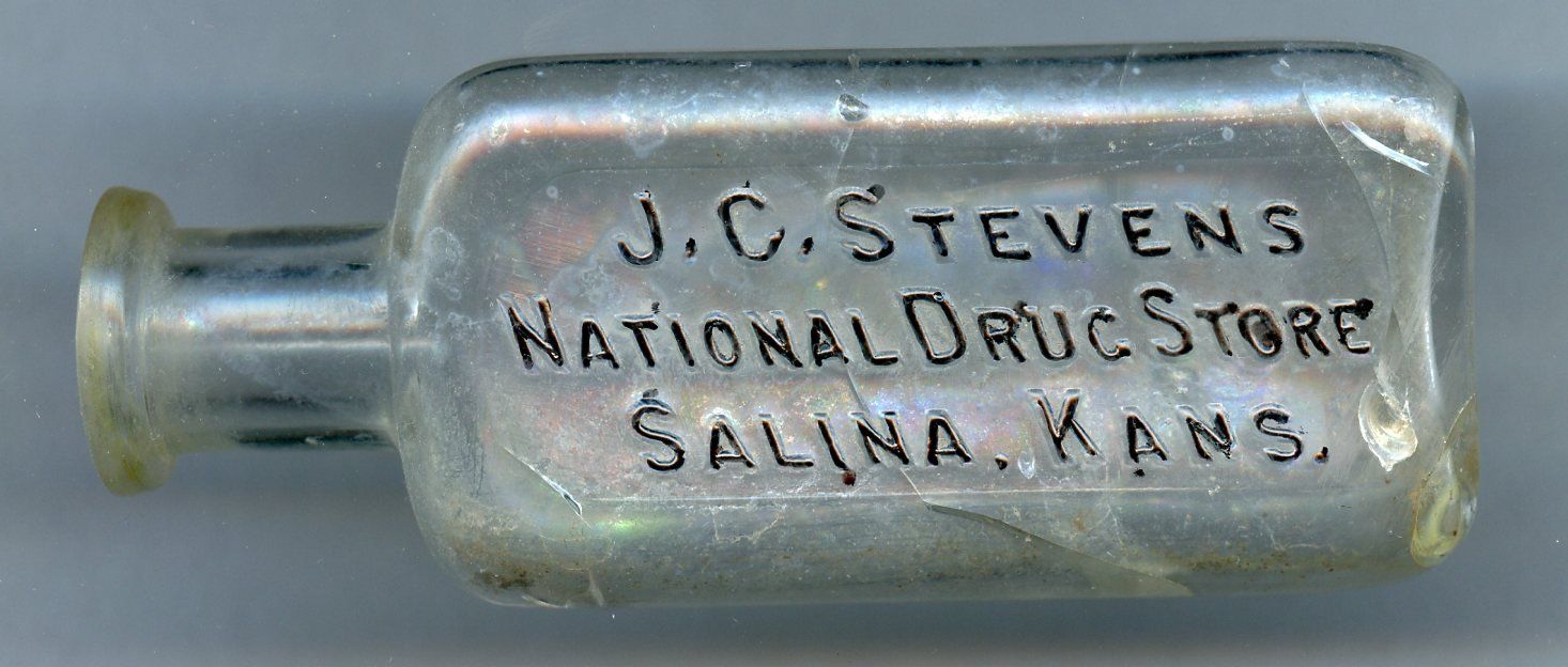 9103 Stevens, J. C.; National Drug Store; 1900; Clear glass, Milburn Oval; corner seams to neck, for cork stopper, back embossed; 1.6" x 0.8" x 4.3"; Courtesy Crispin's Drug Store Museum, Lincoln, KS