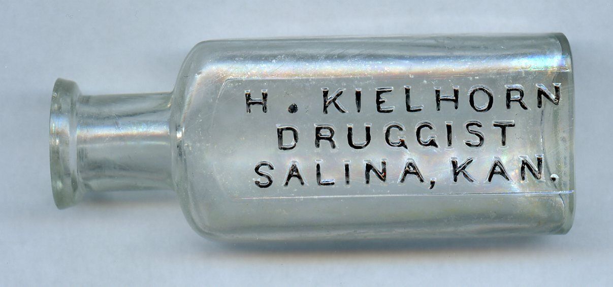 9104 H. Kielhorn, Druggist; 1891-1894; Clear glass, Knickerbocker Oval; corner seam to neck; embossed back; for cork stopper; 1.3" x 0.8" x 3.5"; Courtesy Crispin's Drug Store Museum, Lincoln, KS