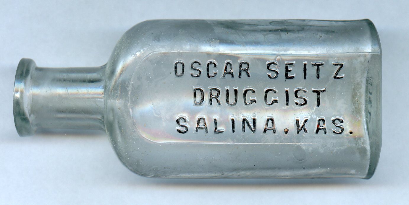 1114 Seitz, Oscar, Druggist, 1866-1888; Clear glass, Philadelphia Oval style, side vseams to neck, for cork stopper, back embossed; 1.7" x 1.1" x 4.2"; Courtesy Crispin's Drug Store Museum, Lincoln, KS