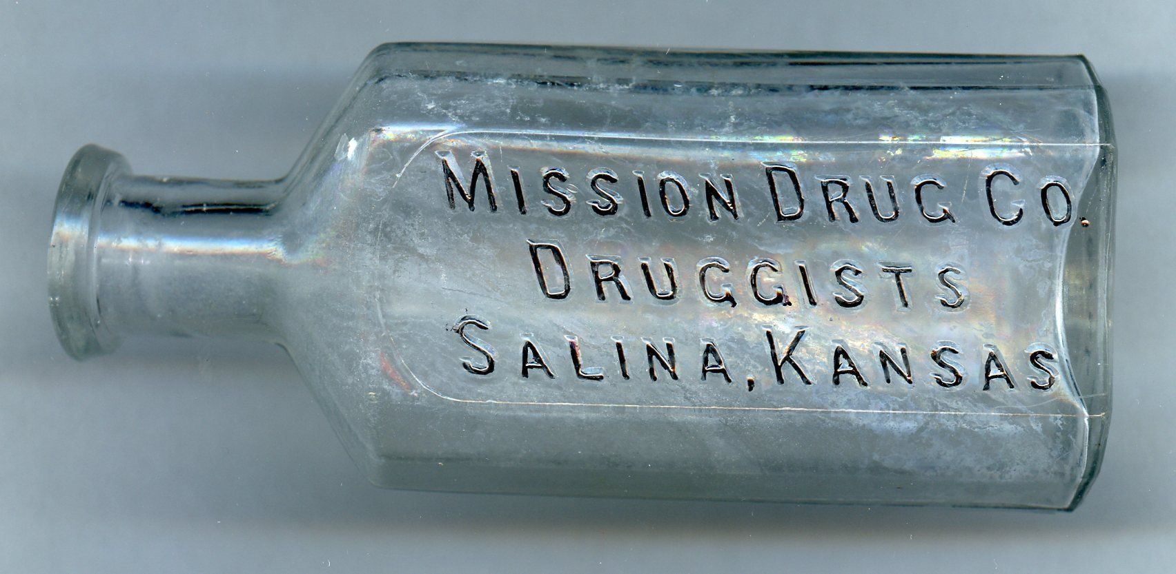 9478 Mission Drug Co.; 1915; Clear glass, side seams to neck, for cork stopper, back embossed; 2.2" x 1.3" x 5.2"; Coutesy Crisin's Drug Store Museum, Lincoln, KS