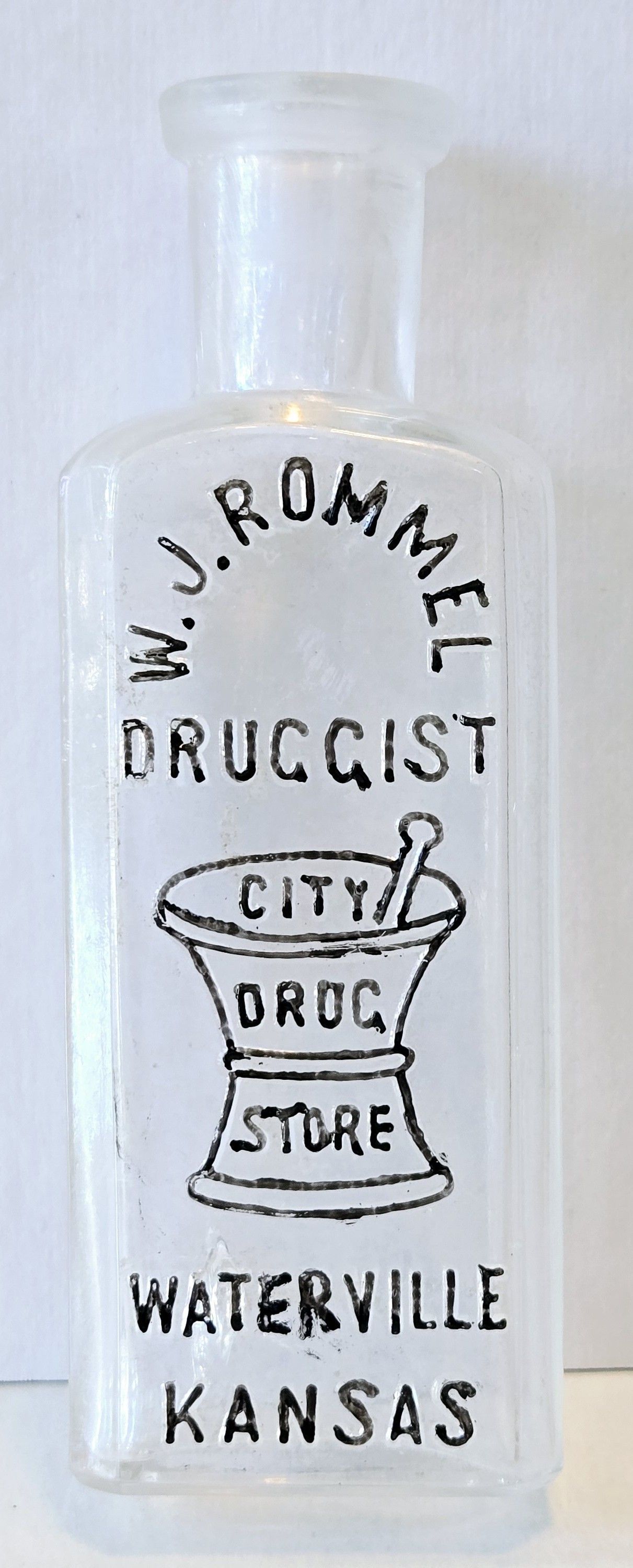 Born in Missouri in 1850, William J. Rommel graduated from The St. Louis School of Pharmacy in 1869. After a couple of stops on his way west, he arrived in Waterville, KS, in 1876. He opened the City Drug Store and became very involved in the city, serving at times as the City Treasurer, City Council President and Mayor. He died in 1900 from "pulmonary consumption", or tuberculosis. His wife keeps the drug store running, as the City Drug Store, Mrs. W. J. Rommell, Proprietress, by hiring druggists to run the prescription department, until her son Otto passes the State licensing exam in Hutchinson in 1905. When he takes over the operation, he renames it the Rommel Drug Co. and it continues until 1926.