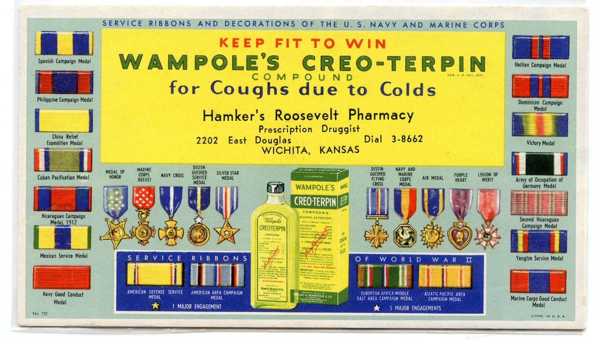 10127 Hamker's Roosevelt Pharmacy, 1940's; Ink blotter, advertising Wampole's Creo-Terpin; decorated with various Navy & Marine medals & ribbons; 6.2" x 3.5"; Courtesy of Crispin's Drug Store Museum, Lincoln, KS