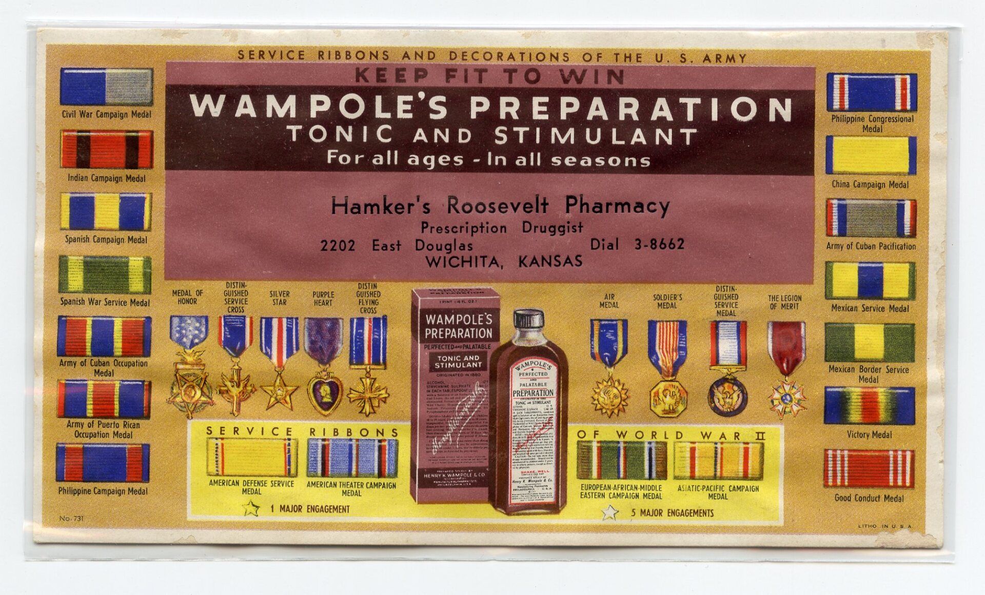 10129 Hamker's Roosevelt Pharmacy, 1940's; Ink blotter, advertising Wampole's Preparation; decorated with various Army medals & ribbons; 6.2" x 3.5"; Courtesy Crispin's Drug Store Museum, Lincoln, KS