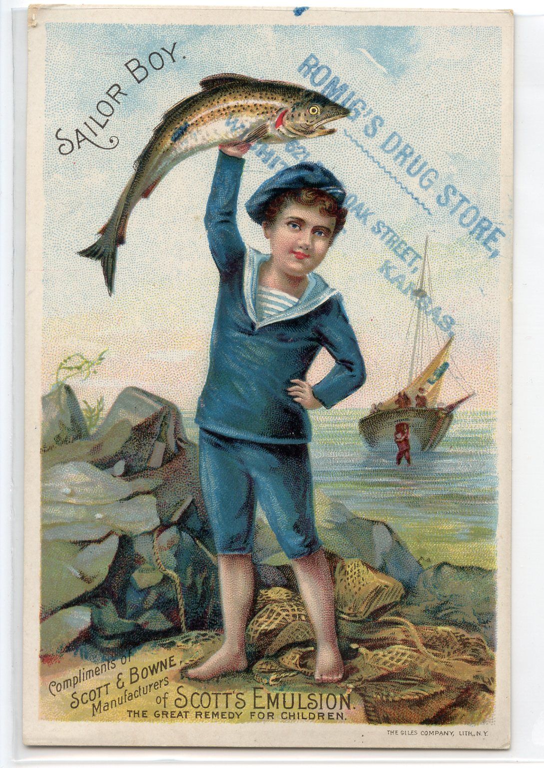 10175 Romig's Drug Store; 1889-1899; Scott's Emulsion trade card, light card stock, rubber stamp of drug store on front; "621 East Oak Street"; 3.2" x 5"; Courtesy Crispin's Drug Store Museum, Lincoln, KS