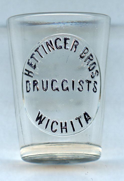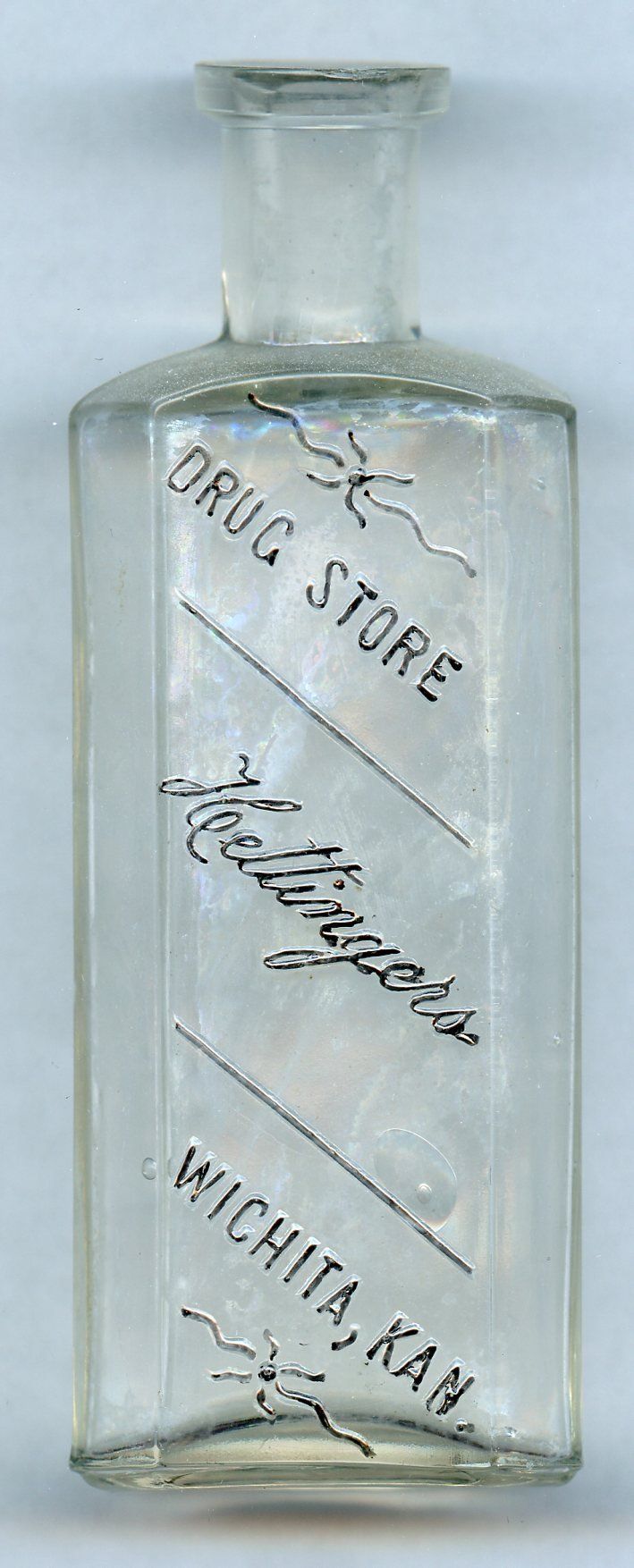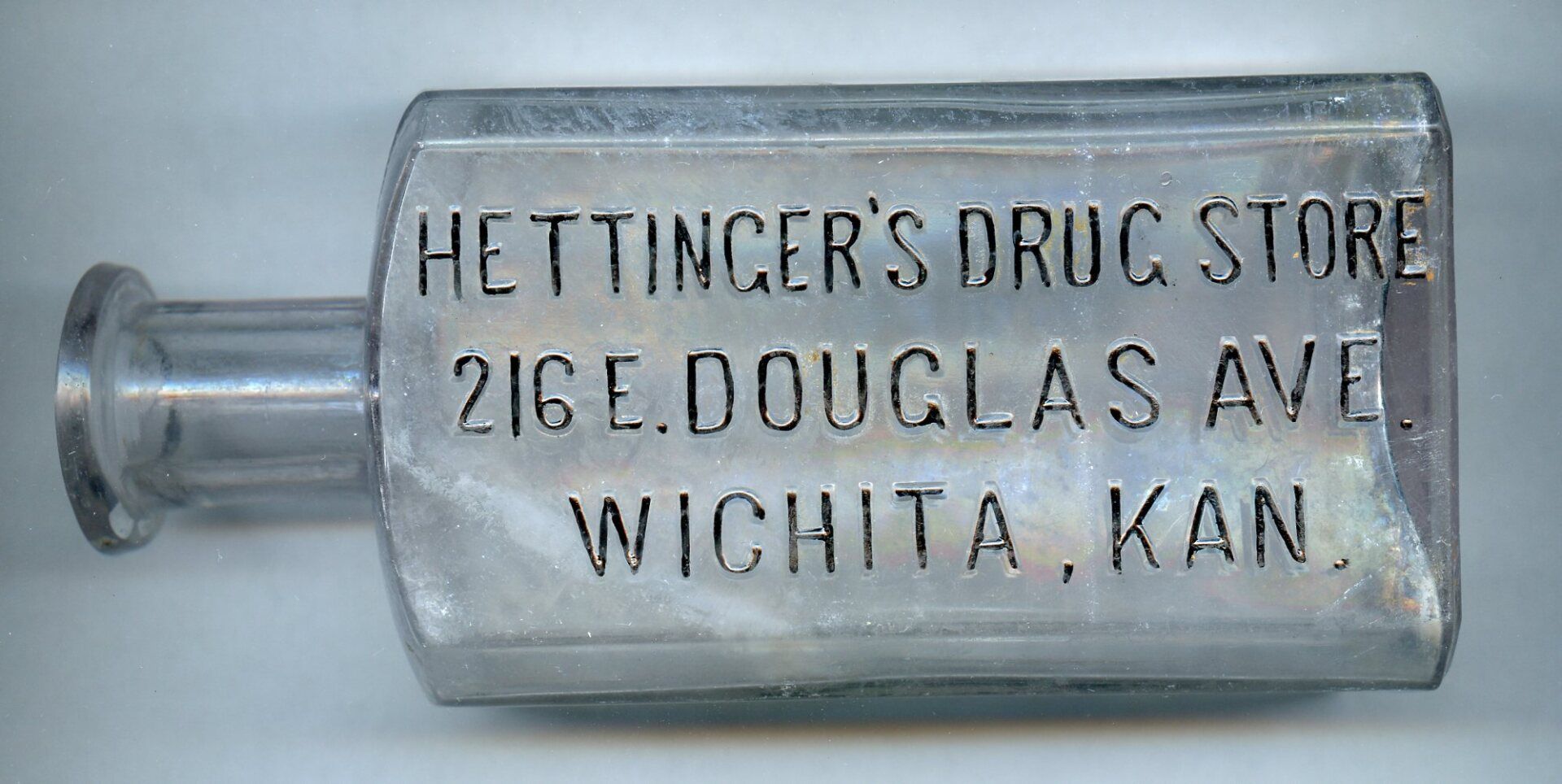 9883 Hettinger's Drug Store, 216 E. Douglas, 1890; Clear glass, blake style, tapered prescription lip, for cork stopper, back embossed; 2.6' X 1.6' x 6.1'; Courtesy Crispin's Drug Store Museum, Lincoln, KS