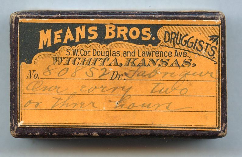 10273 Means Bros., Druggists; 1902-1915; Cardboard shoulder box; paper prescription label, "S. W. Cor. Douglas and Lawrence Ave."; 2.3" x 1.3" x 0.8"; Courtesy Crispin's Drug Store Museum, Lincoln, KS