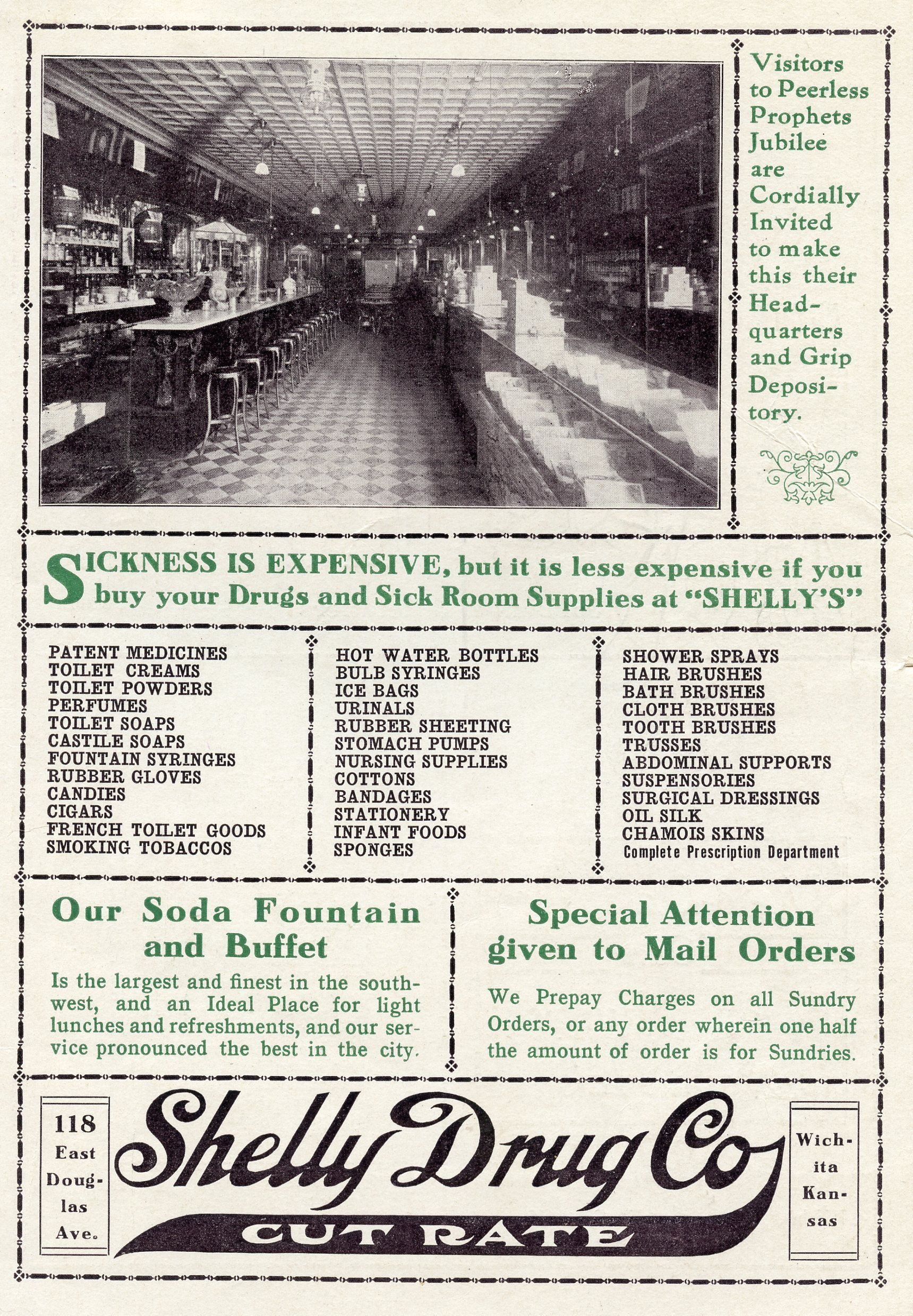 10277 Shelly drug Co.; 1910-1915; Store interior view from program ad; "118 East Douglas Ave."; "Cut Rate"; 5.5" x 8"; Courtesy Crispin's Drug Store Museum, Lincoln, KS