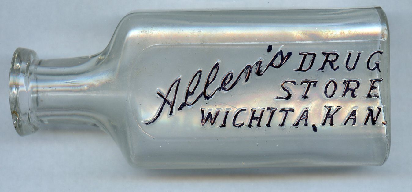 10309 Allen's Drug Store; 1870-1900; Clear glass, Knickerbocker Oval style; back embossed; for cork stopper; 1.7" x 1.1" x 4.2"; Courtesy Crispin's Drug Store Museum, Lincoln, KS