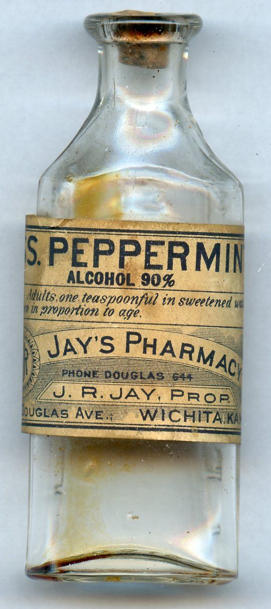 10315 Jay's Pharmacy; J. R. Jay, Prop.; 1912-1915; Clear glass, corked, 1 oz., stock paper repack label: ESS. PEPPERMINT; 1.5" x 0.8" x 3.6"; Courtesy Crispin's Drug Store Museum, Lincoln, KS