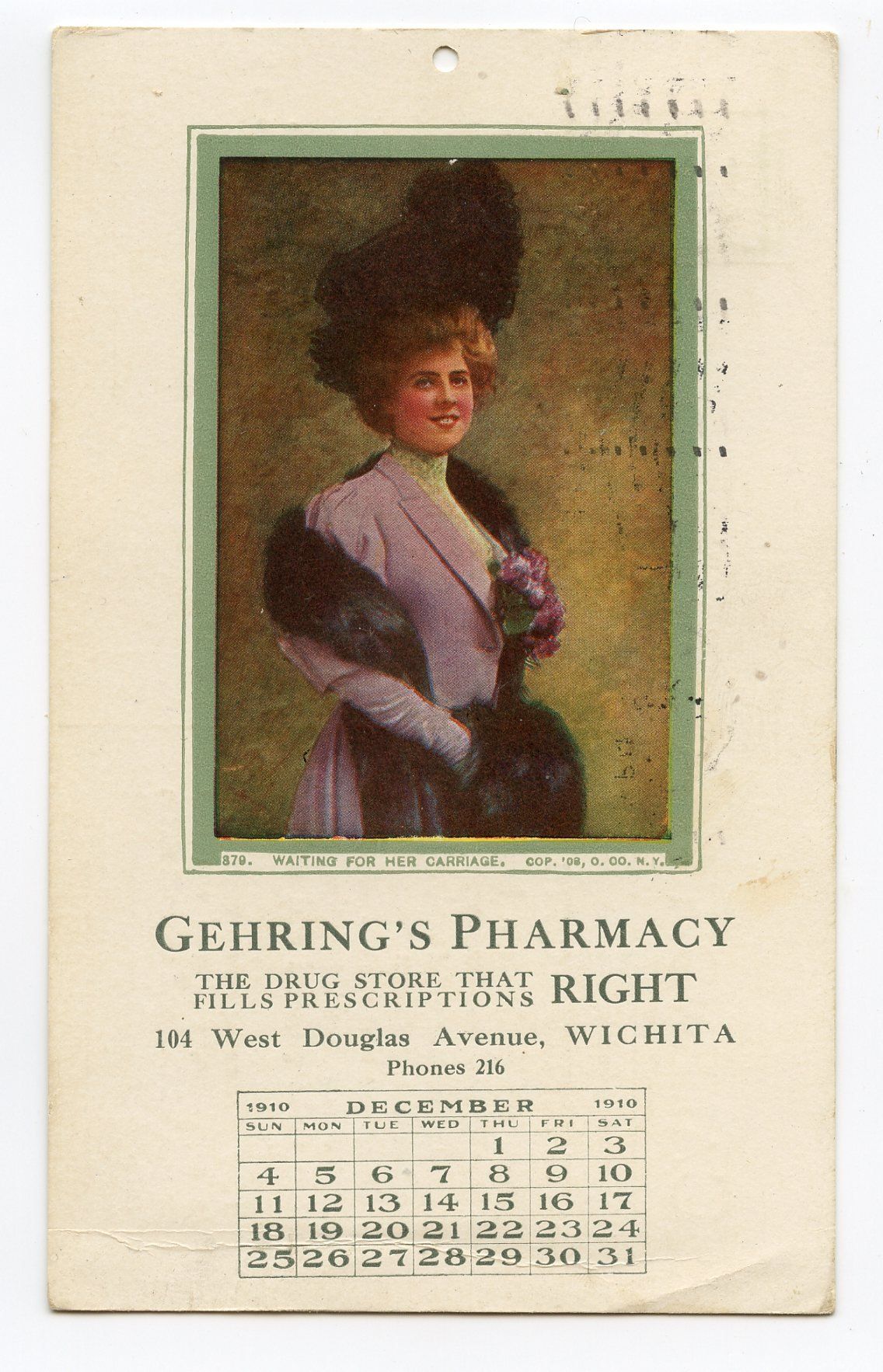10353 Gehring's Pharmacy; 1909-1913; Calendar post card for December, 1910; 3.3" x 5.5"; Courtesy of Crispin's Drug Store Museum, Lincoln, KS