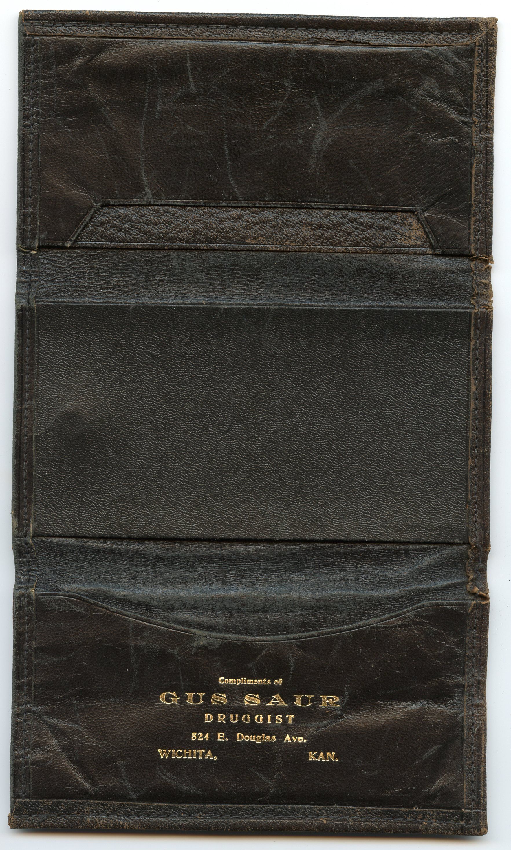 10581 Saur, Gus, Druggist; Wallet. Leather, with imprinted ad; 5.5" x 9.3"; Courtesy Crispin's Drug Store Museum, Lincoln, KS
