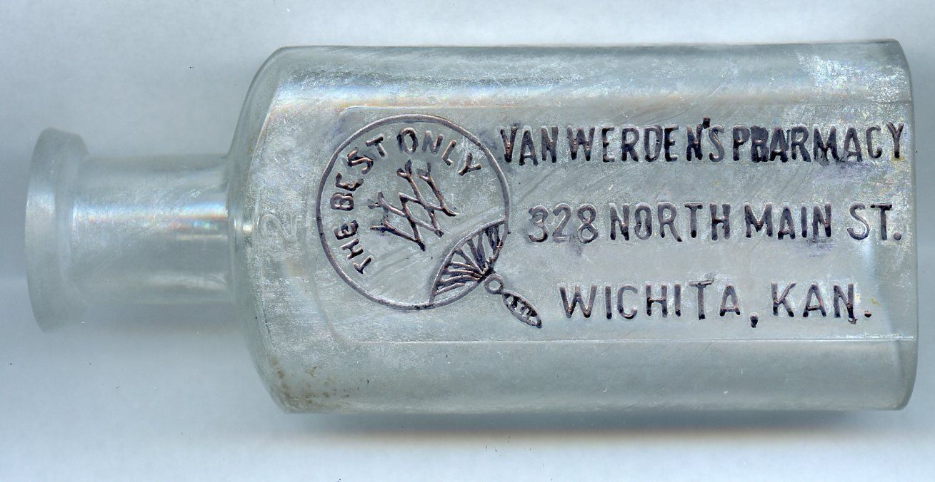 11127 Van Werden's Pharmacy; 1889-1890; Clear glass, Knickerbocker Oval style; back embossed; for cork stopper; 1.7" x 1" x 4.2"; Courtesy Crispin's Drug Store Museum, Lincoln, KS