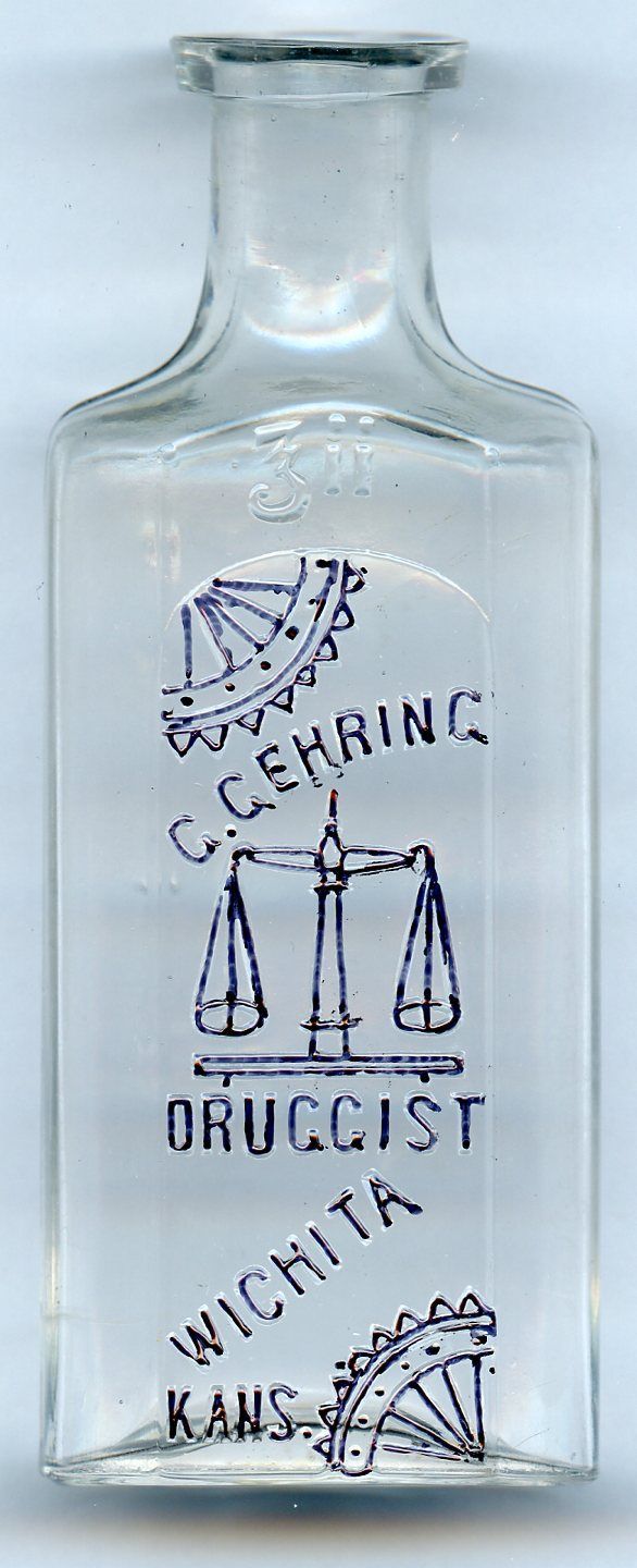 11351 G. Gehring, Druggist; 1890-1908; Clear glass; 2 oz.; back embossed; for cork stopper; 1.7" x 1" x 4.3"; Courtesy Crispin's Drug Store Museum, Lincoln, KS