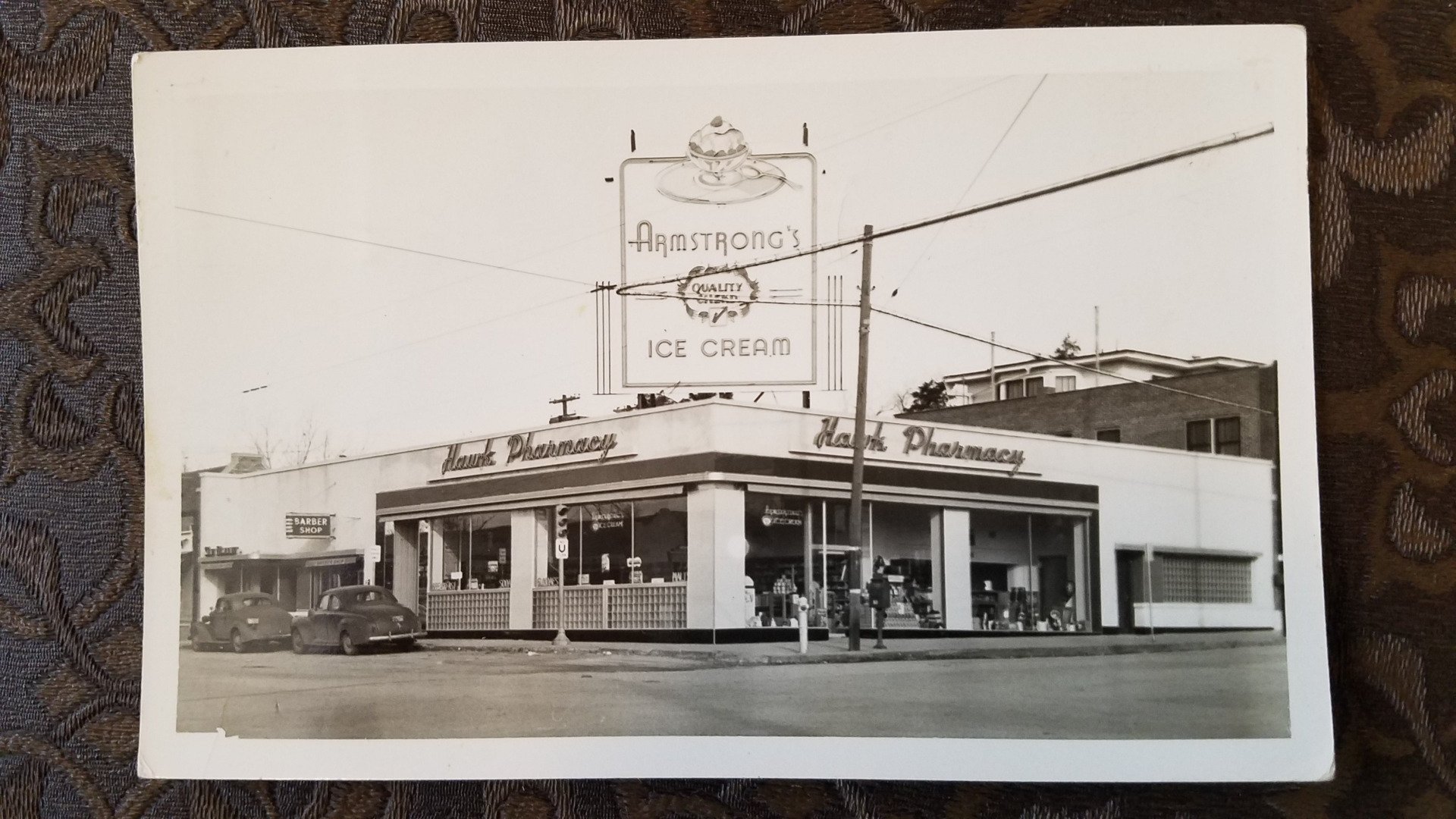 12563 Hawk Pharmacy: 1948; picture postcard of store exterior; 5.5" x 3.5"; Courtesy Crispin's Drug Store Museum, Lincoln, KS