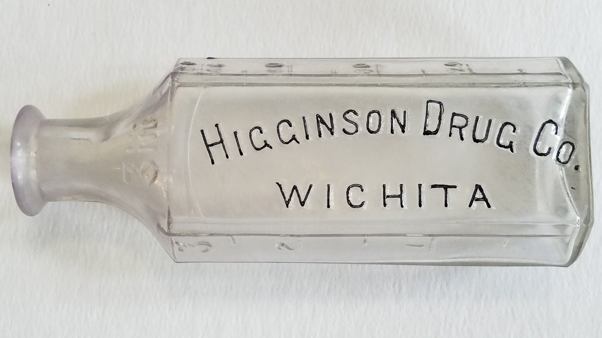 12634 Higginson Drug Co.: 1904-1913; clear glass Rx oval style bottle with embossed back; for cork stopper; 1.8" x 1.1" x 5"; Courtesy Crispin's Drug Store Museum, Lincoln, KS