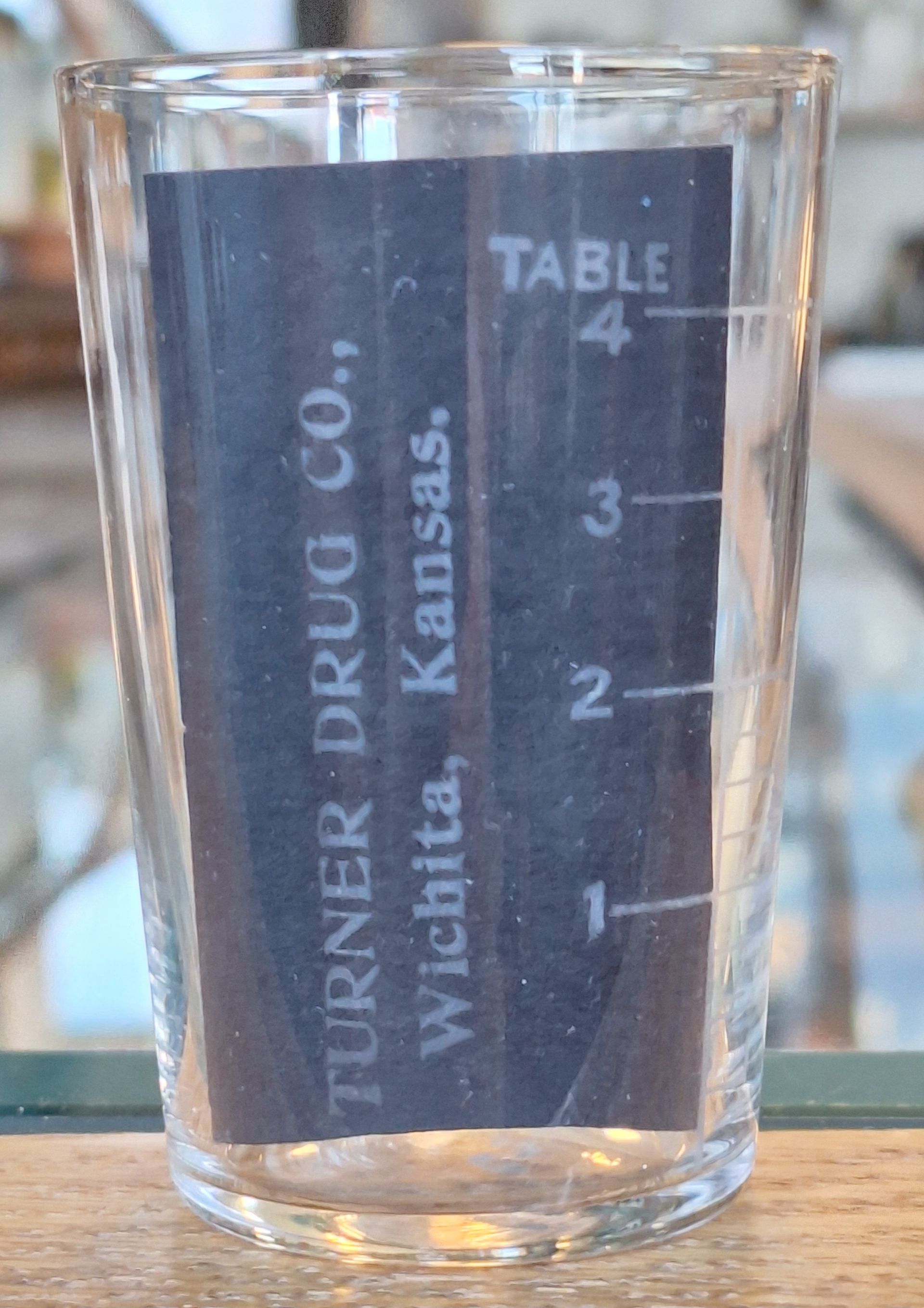 6623 Turner's Drug Co.: clear glass; no seams; 4 tablespoonful size; 1.5" x 1.5" x 2.7"; Courtesy Crispin's Drug Store Museum, Lincoln, KS