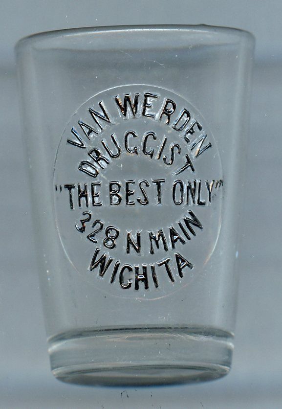 6693 Van Werden, Druggist; 1889-1912; Clear glass, back embossed with graduations: tea, desert & tablespoon; 1.8" x 1.8" x 2.2"; Courtesy Crispin's Drug Store Museum, Lincoln, KS
