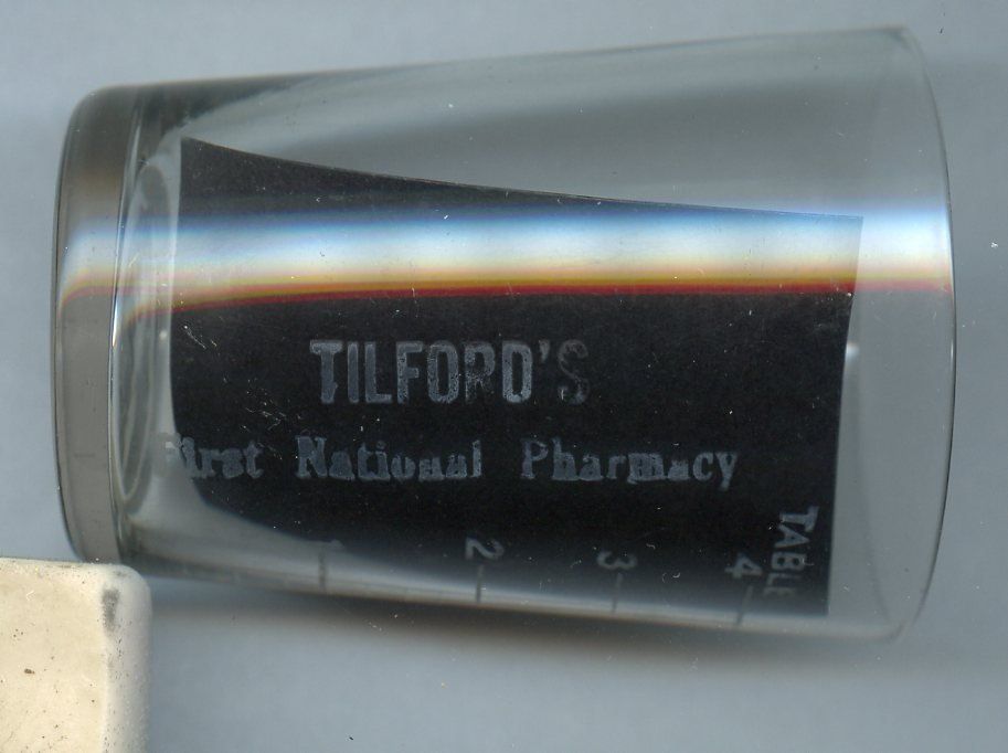 9139 Tilford's First National Pharmacy; 1922; Thin clear glass, 4 tablespoon or 1 wine glass capacity; etched: TILFORD'S // First National Pharmacy; 1.8" x 1.8" x 2.7"; Courtesy Crispin's Drug store Museum, Lincoln, KS