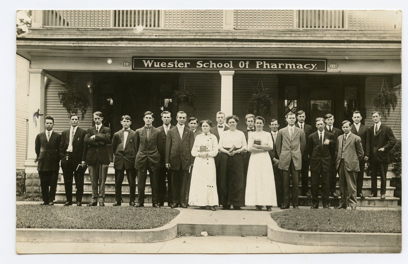 9142 Wuester School of Pharmacy, 1901; Post card, building exterior, students and faculty; 5.3" x 3.3"; Courtesy Crispin's Drug Store Museum, Lincoln, KS